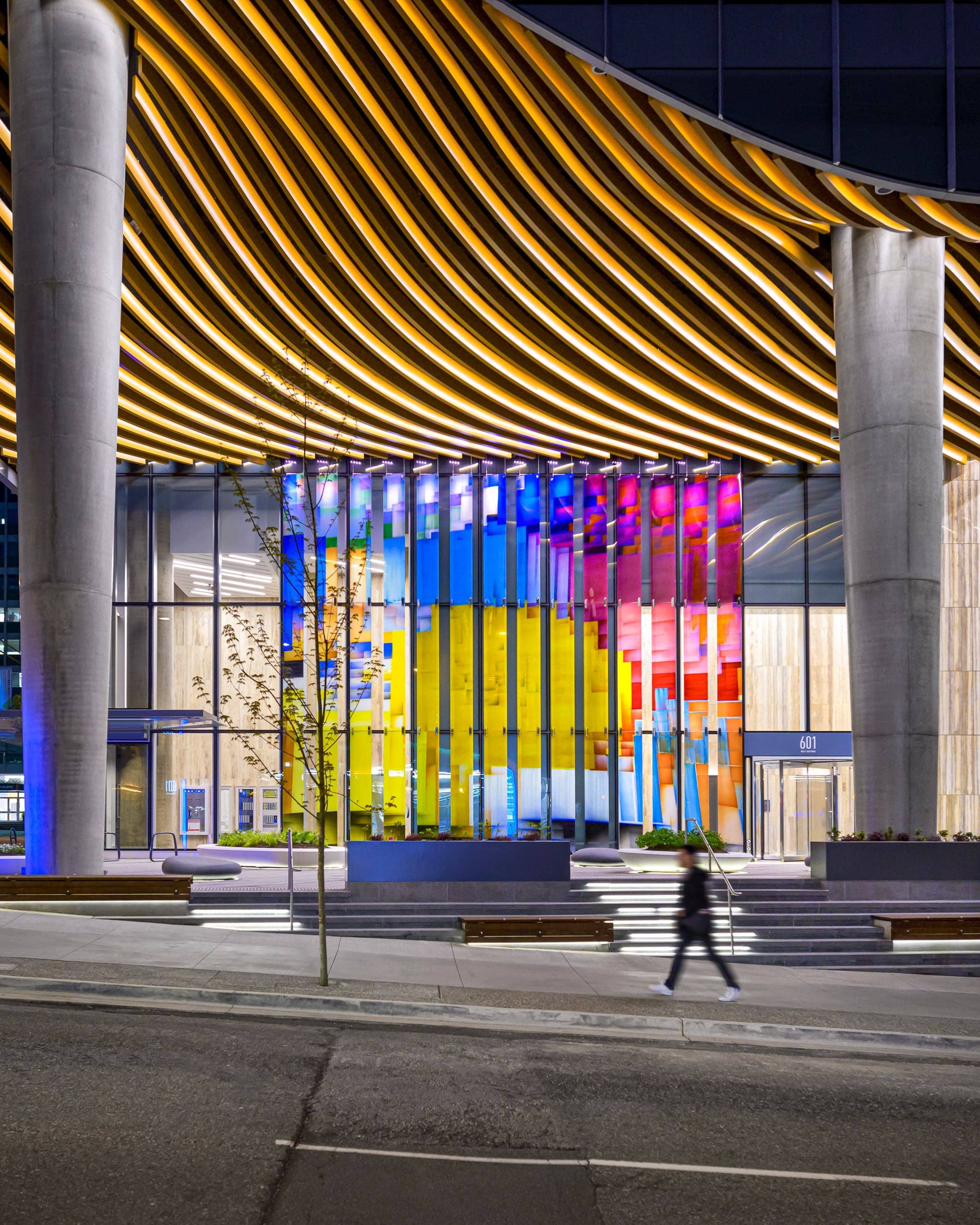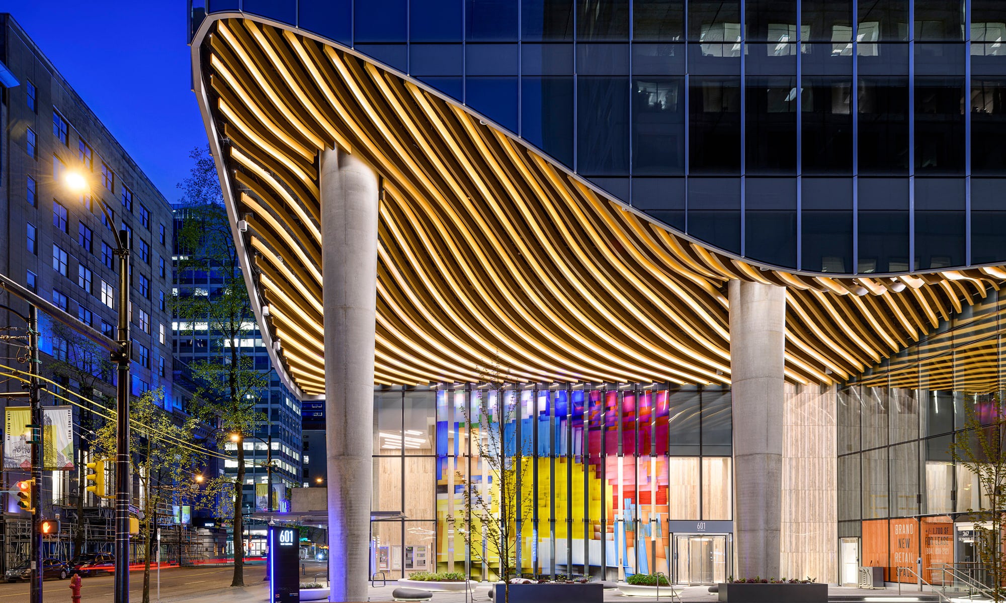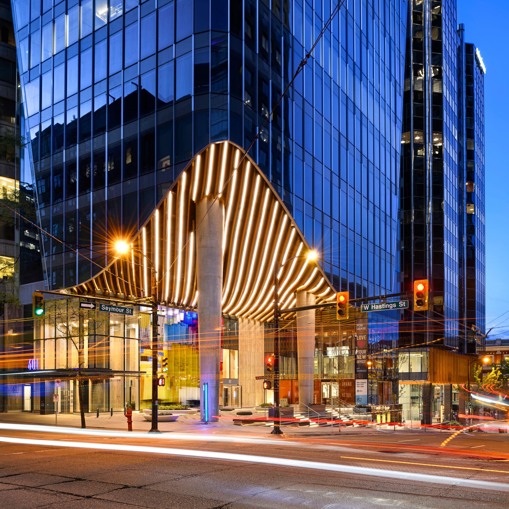 Located near the largest transportation hub in Downtown Vancouver, the newly redesigned 601 West Hastings 25-storey office tower has set the standard for the regeneration within the area. Mac’s II Agencies worked alongside Smith + Andersen, in conjunction with B+H Architects and Protec Installations Group, to help illuminate the sculpted overhang prominently featured on the building’s corner plaza.