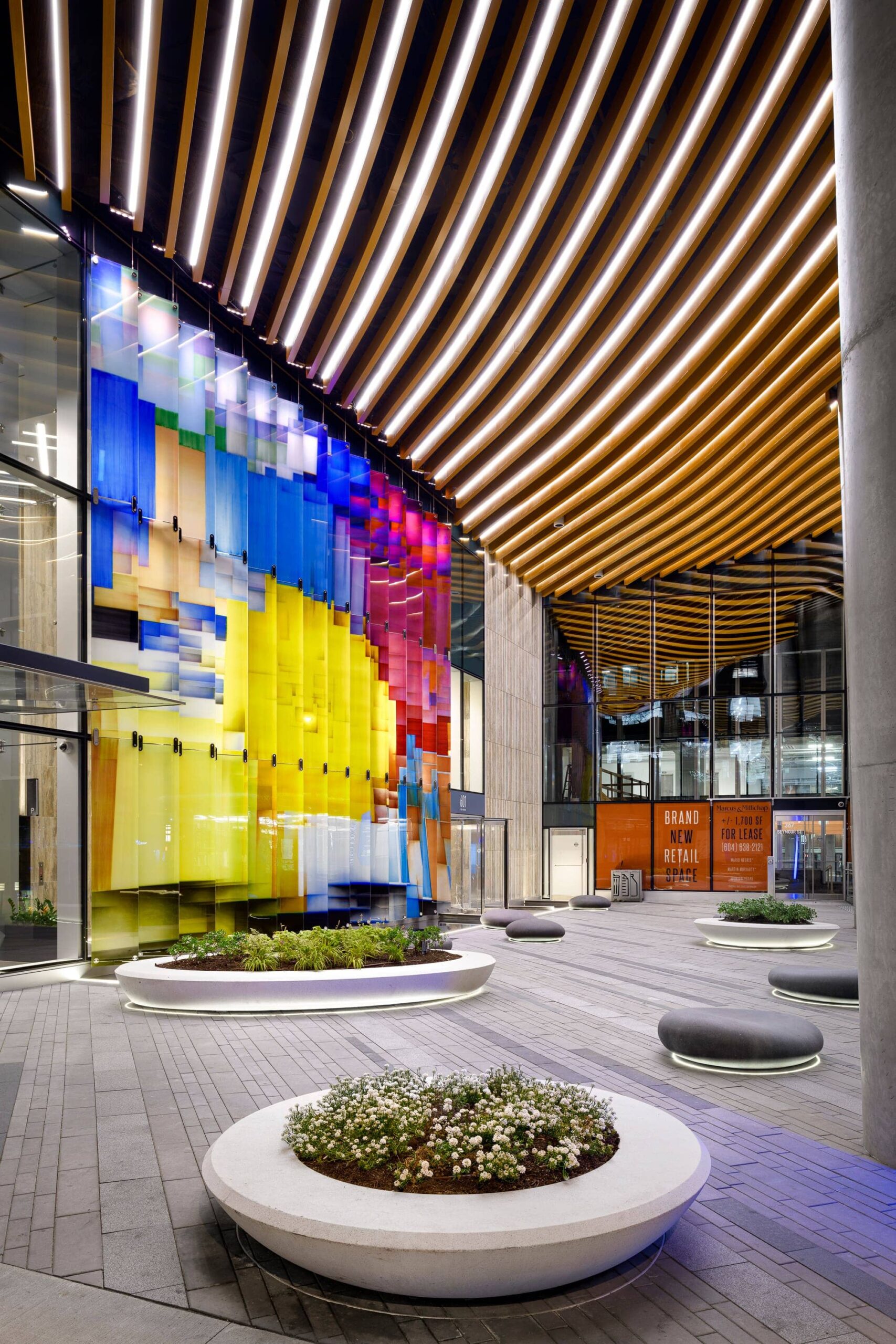 On route to being deemed a LEED Canada-CS Gold building, the beautifully sculpted organic ceiling is complimented by Kelvix LED Tape Lighting, which was strategically integrated into the curved wooden soffits. The strips of light amplify the stunning architecture and add to the strong streetscape presence which invites all those around to the community plaza area – day or night.