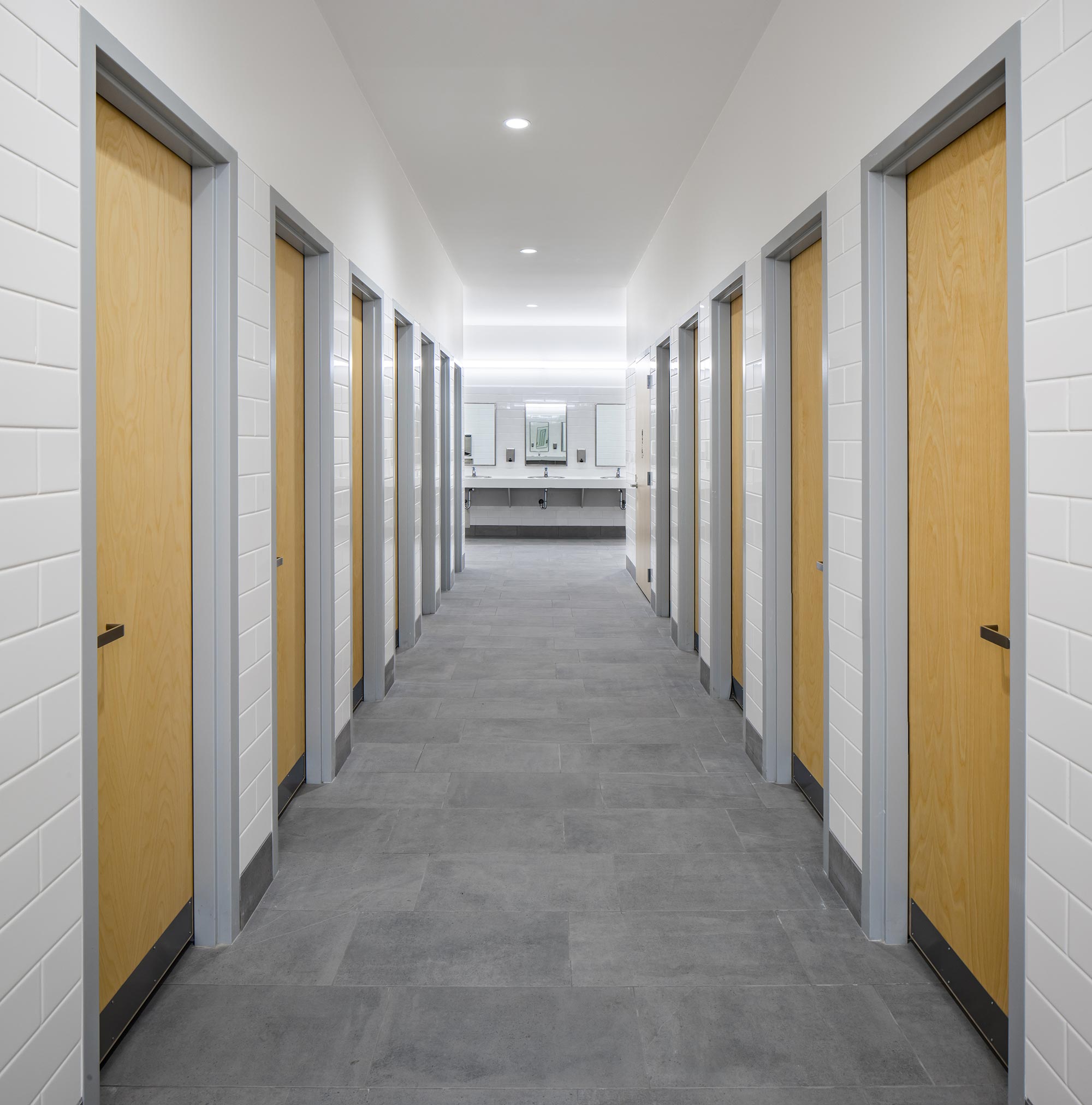 Indoors, a diverse array of lighting solutions enriches the interior spaces. Recessed Cruze troffers from Cooper Lighting Solutions: Metalux provide efficient and even illumination, while the Air (Architectural Lighting System) and Beam wall-mounted luminaires from Axis Lighting offer a blend of functional and ambient lighting. Cooper Lighting Solutions’ Portfolio Downlights and cylinders add focused lighting where needed, while the Jaylum suspended indirect/direct fixtures from Corelite and Define units from Neo-Ray, both from Cooper Lighting Solutions, contribute to the modern and sleek lighting design.