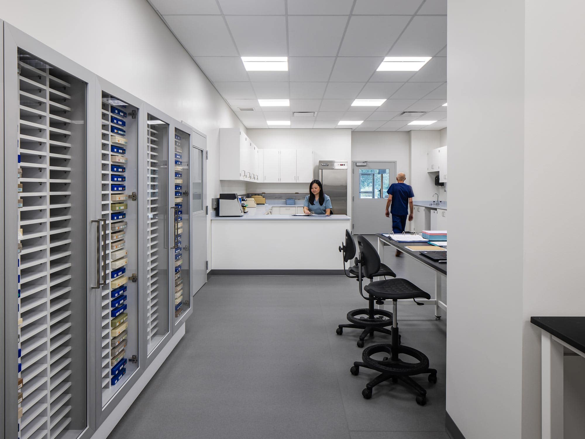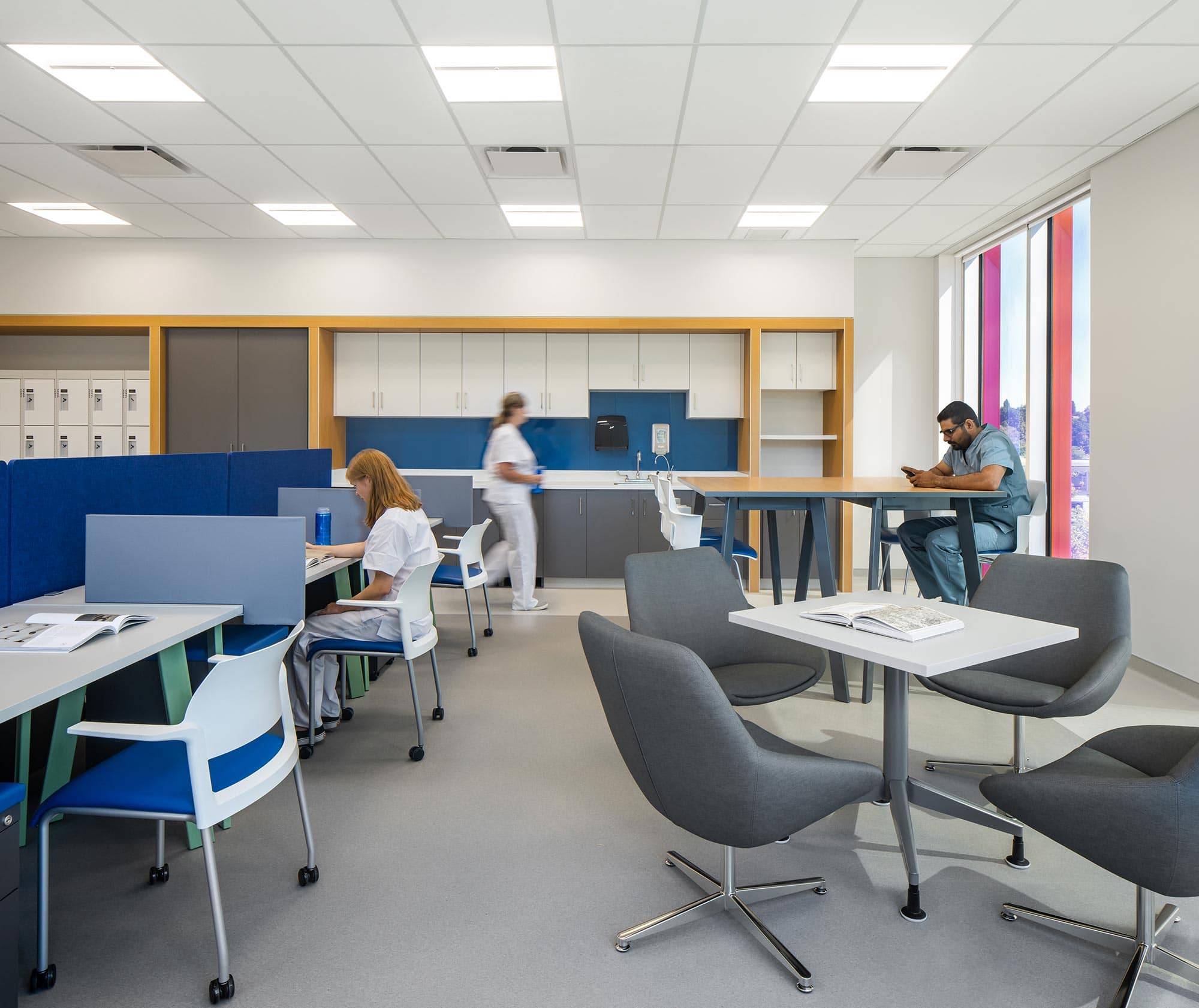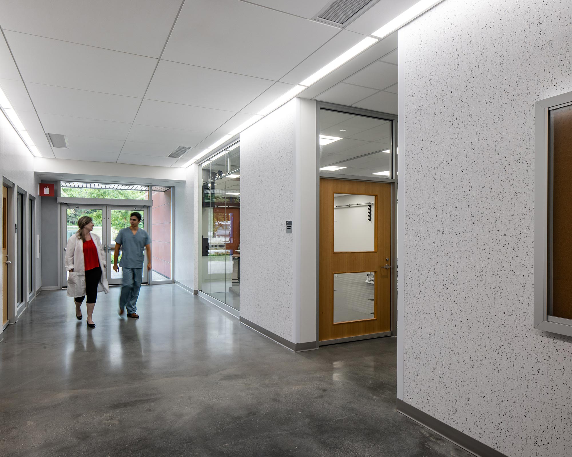 - The FORUM LED Panel Light, from Liteline — These panels were purposely mounted along the corridor edges to reflect that of a hospital’s hallways. Having the FORUM placed off to the sides prevents patients, wheeled on gurneys, from being irritated by the light shining directly in their field of vision when transported from one location to the next.
