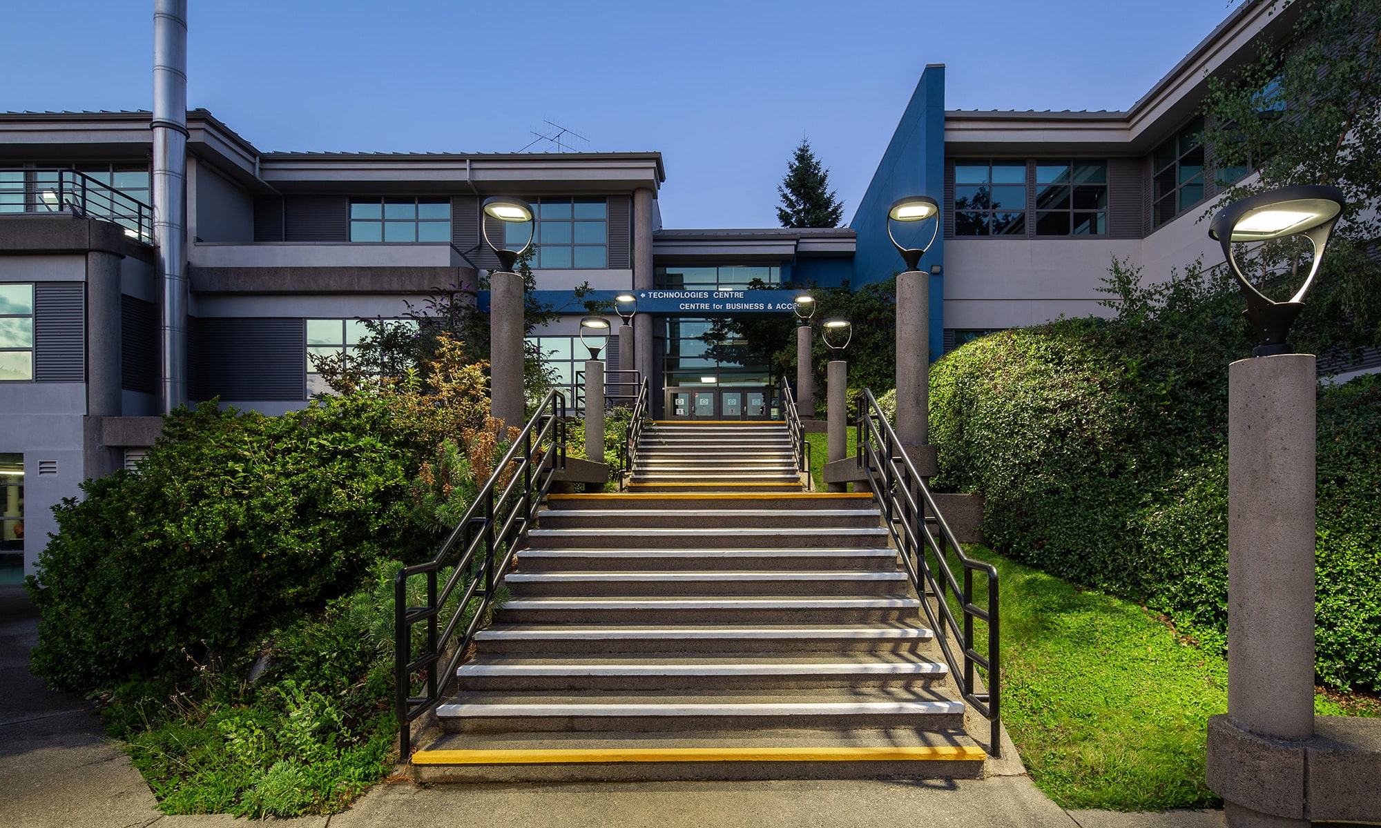 The Bazil, distinguished by its softly curved body that emits a gentle light, is seamlessly incorporated throughout the campus landscape. The anodized aluminum alloy bollards enhance wayfinding without compromising on aesthetics or longevity. Complementing this luminaire is the use of the Versatile LED Post Tops (VPTs) from Above All, strategically placed atop concrete cylinders parallel to an entryway staircase, providing functional and aesthetic illumination.