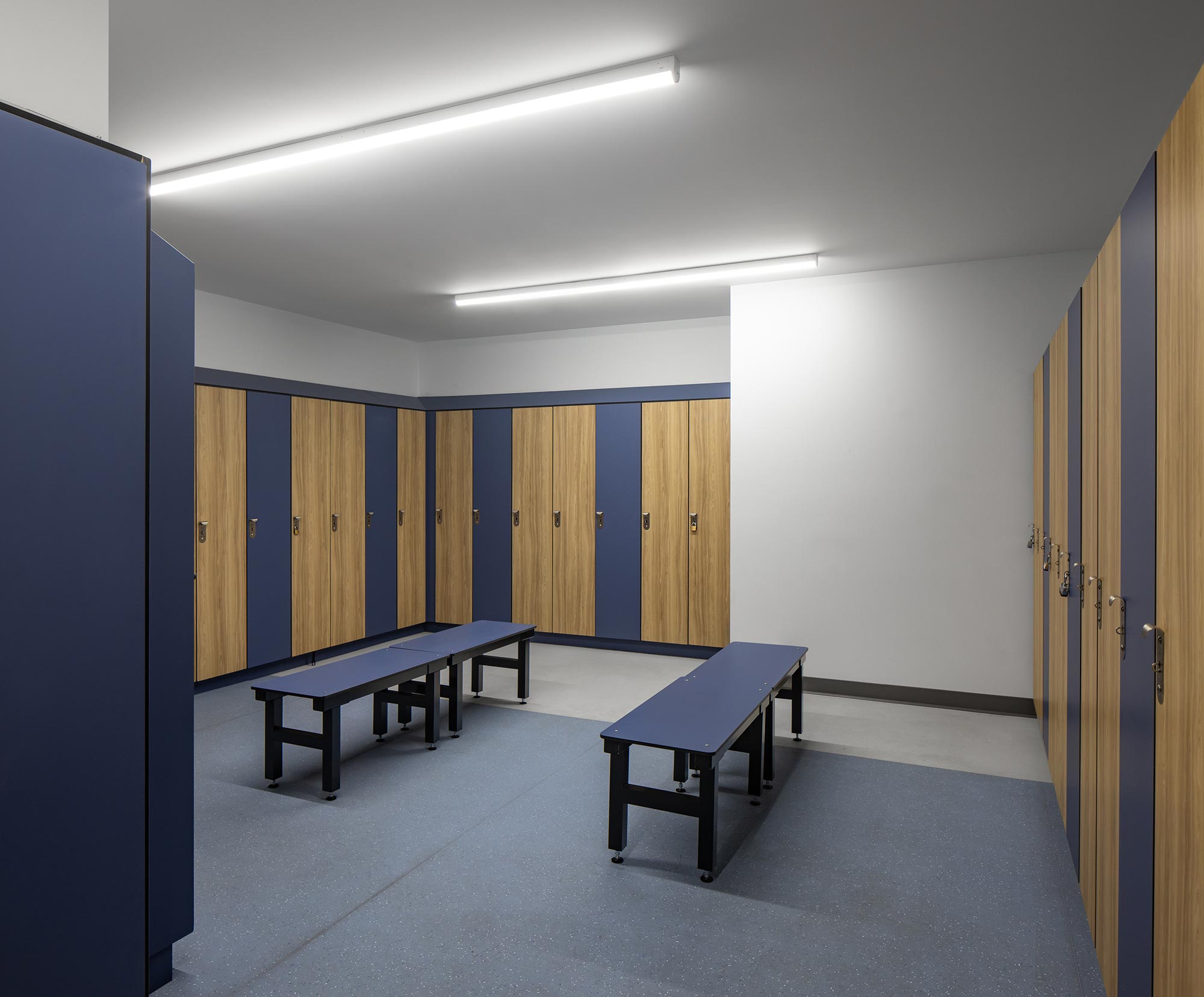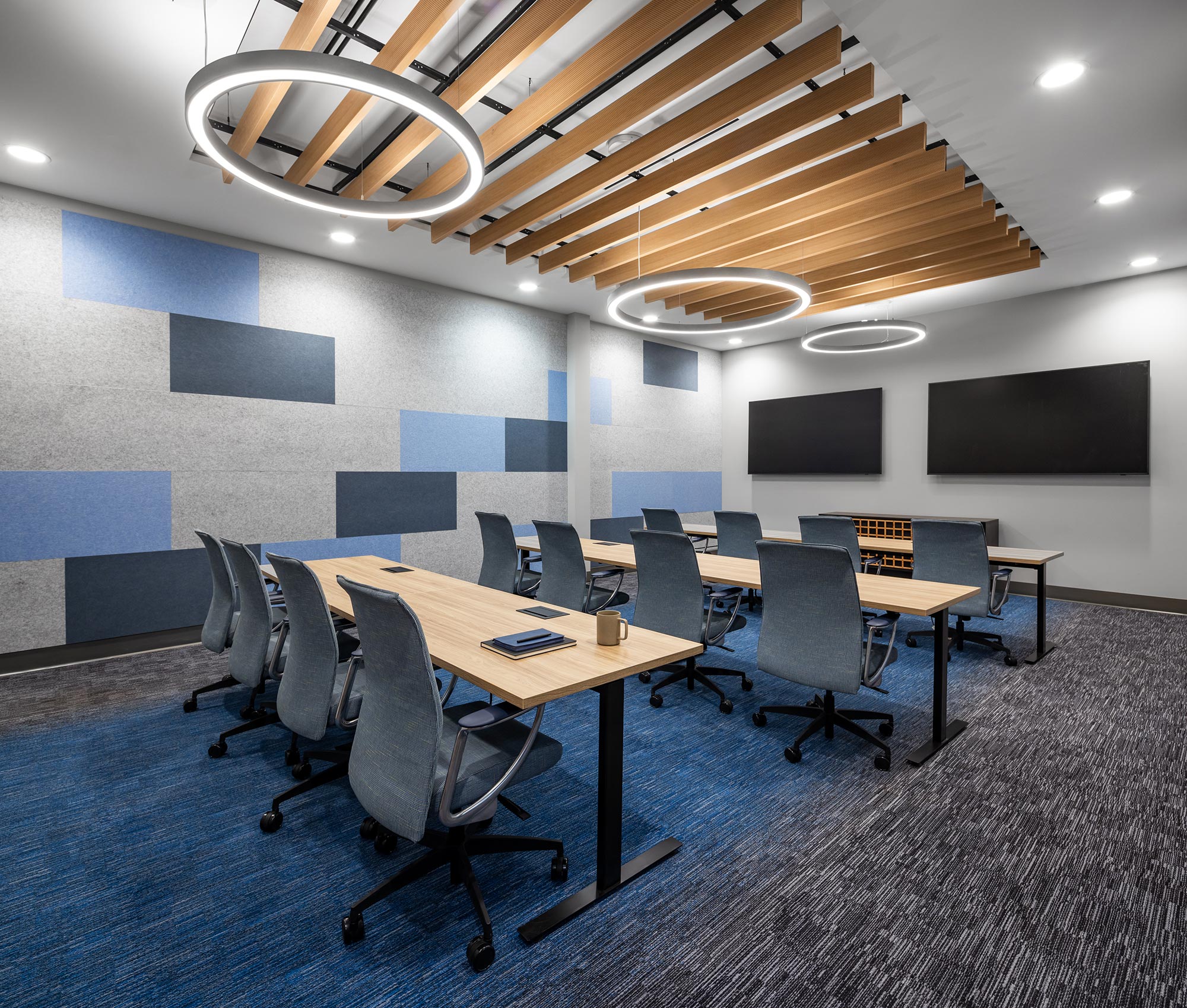 The sleek, soft-lined linear LEDs from the Prime family by Axis Lighting were another key component of the lighting design. These fixtures, both pendant and surface-mounted, added a sophisticated touch to the space. Their rounded wedge forms provided contrast when slotted between the clean-cut acoustic panels. The ED RING+ circular architectural luminaires from Edison Lighting also added a stylish contrast against hard linear lines in the presentation-style areas.
