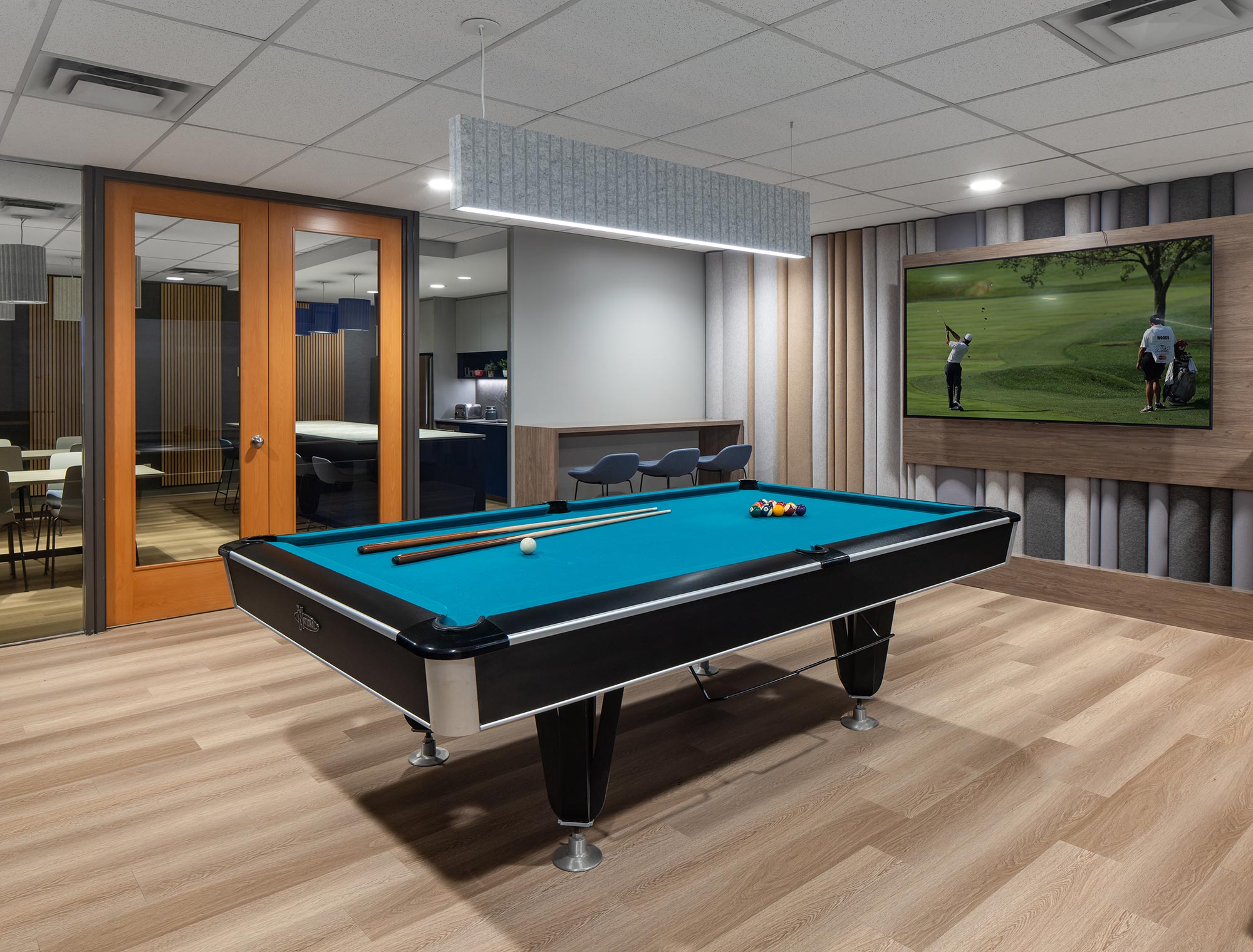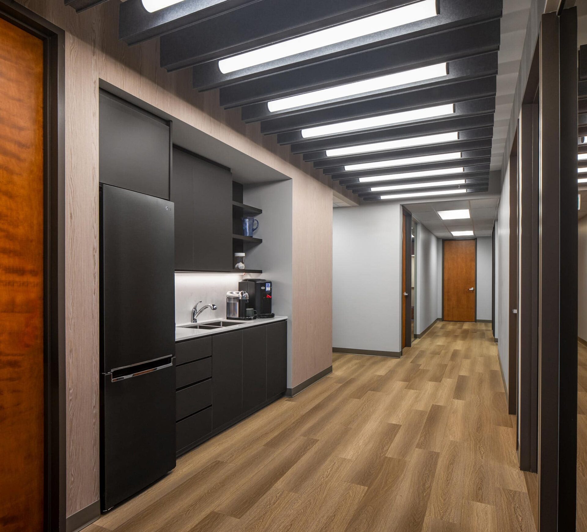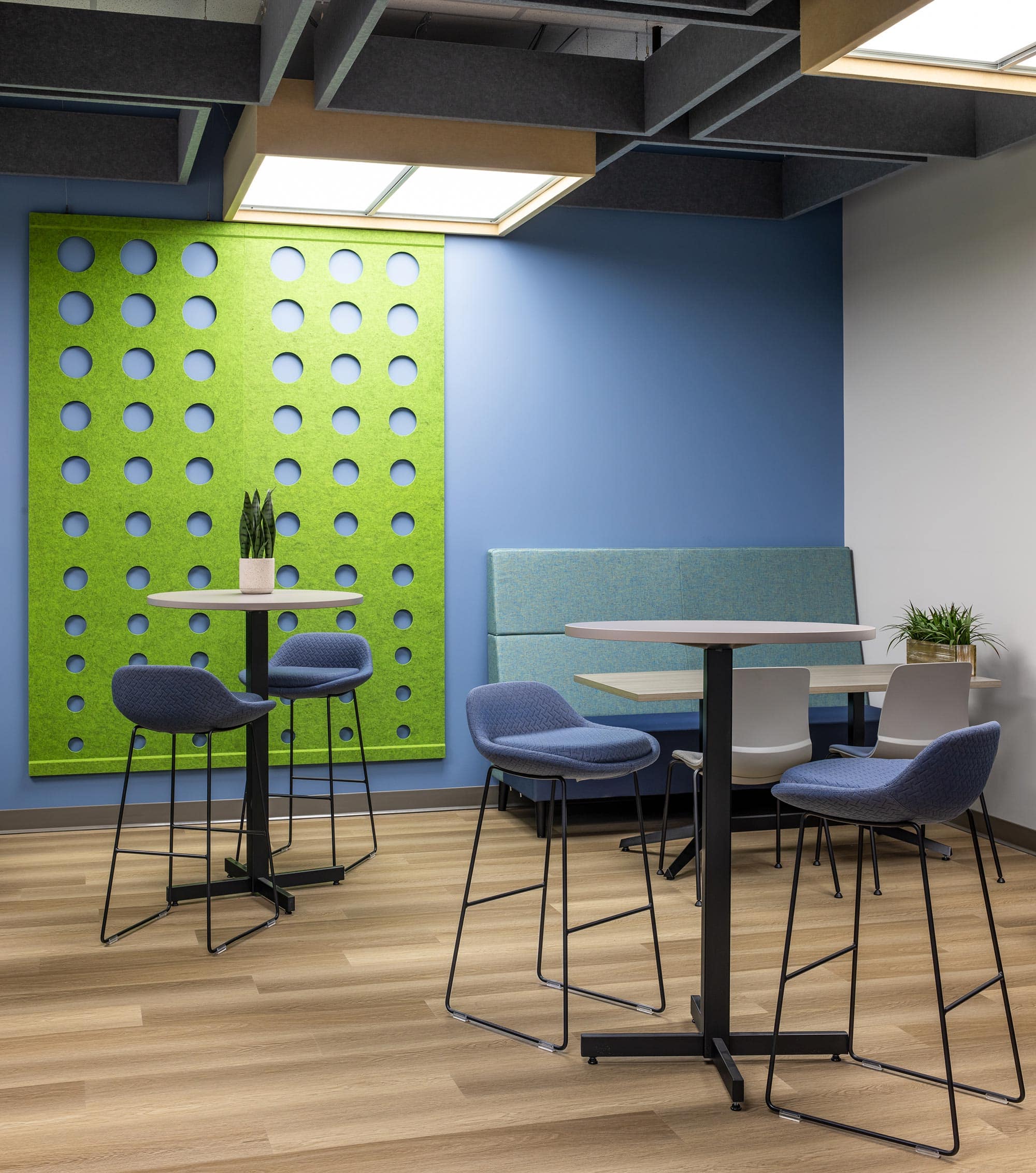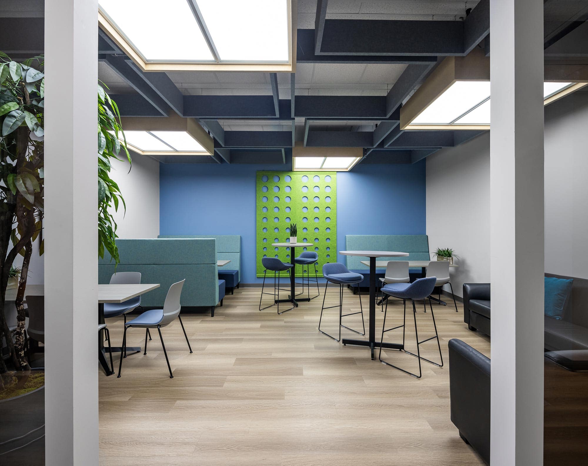 To enhance visual impact and functionality, Cooper Lighting’s Metalux troffers (GRLED series) were used. These troffers were cleverly elevated and surrounded by shadow boxes, transforming them into striking elements that added character and depth to the space. The geometrical pattern created with the encased troffers and patterned acoustic panels, provided both sufficient ambient LED light and a visually appealing design.