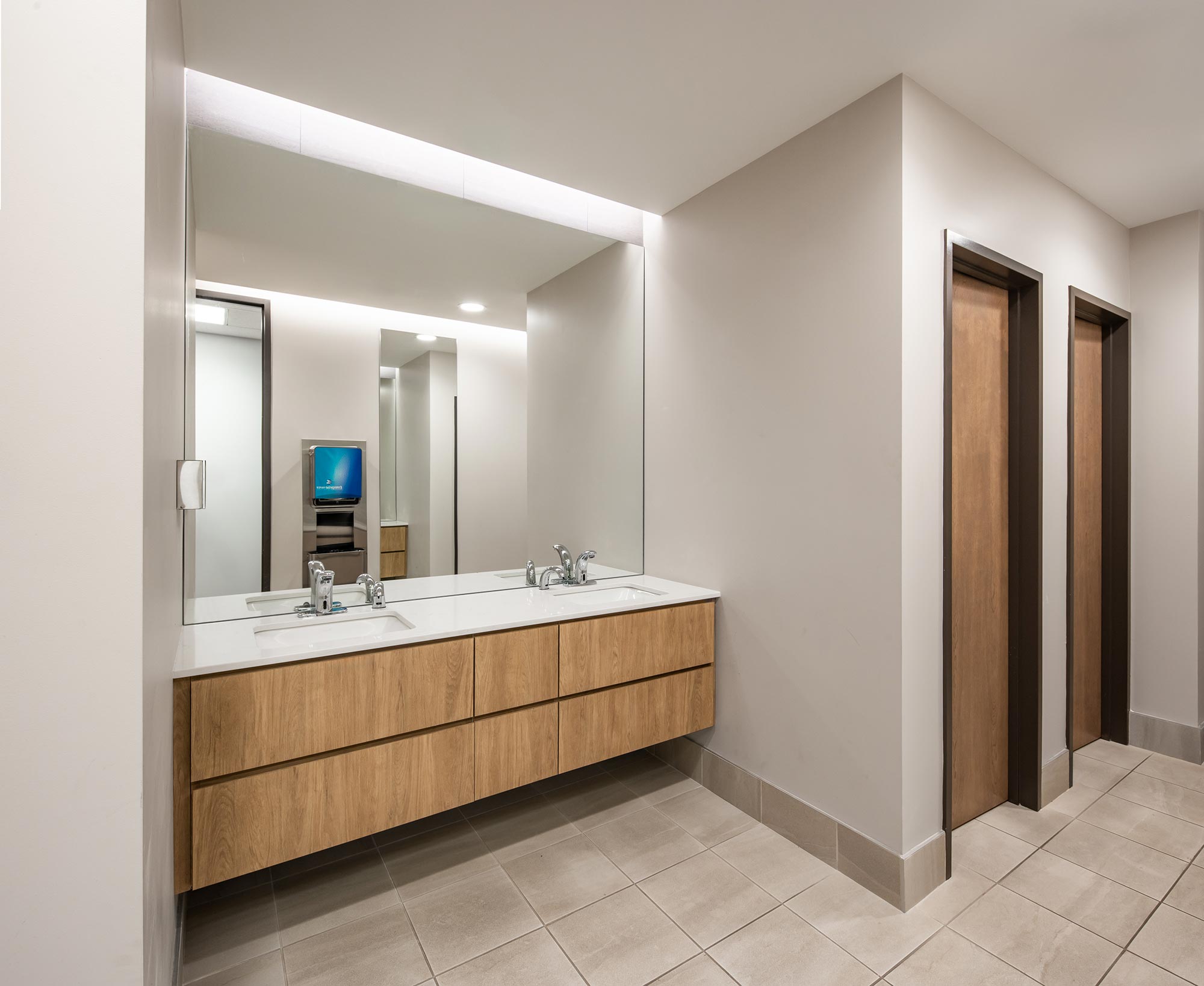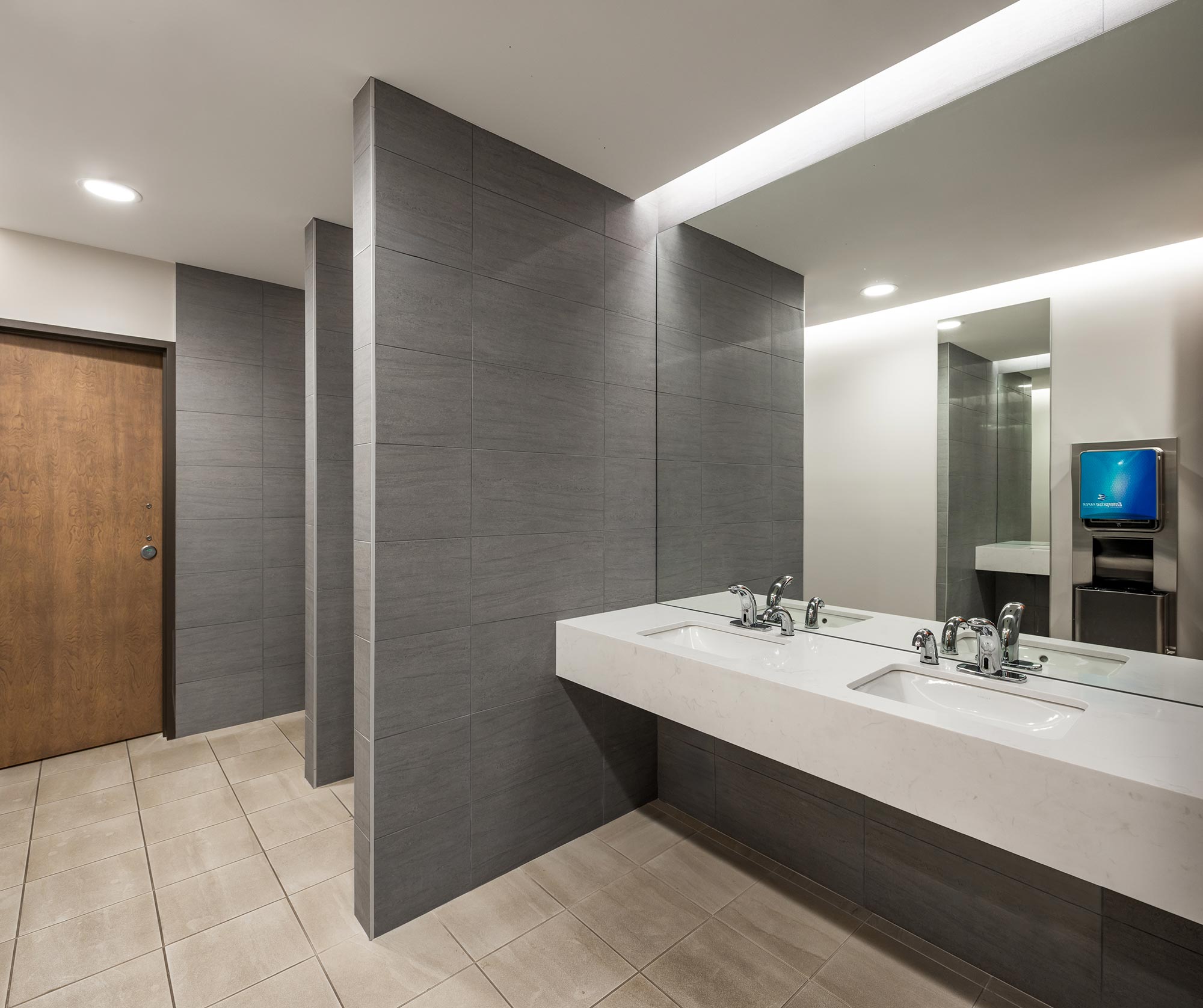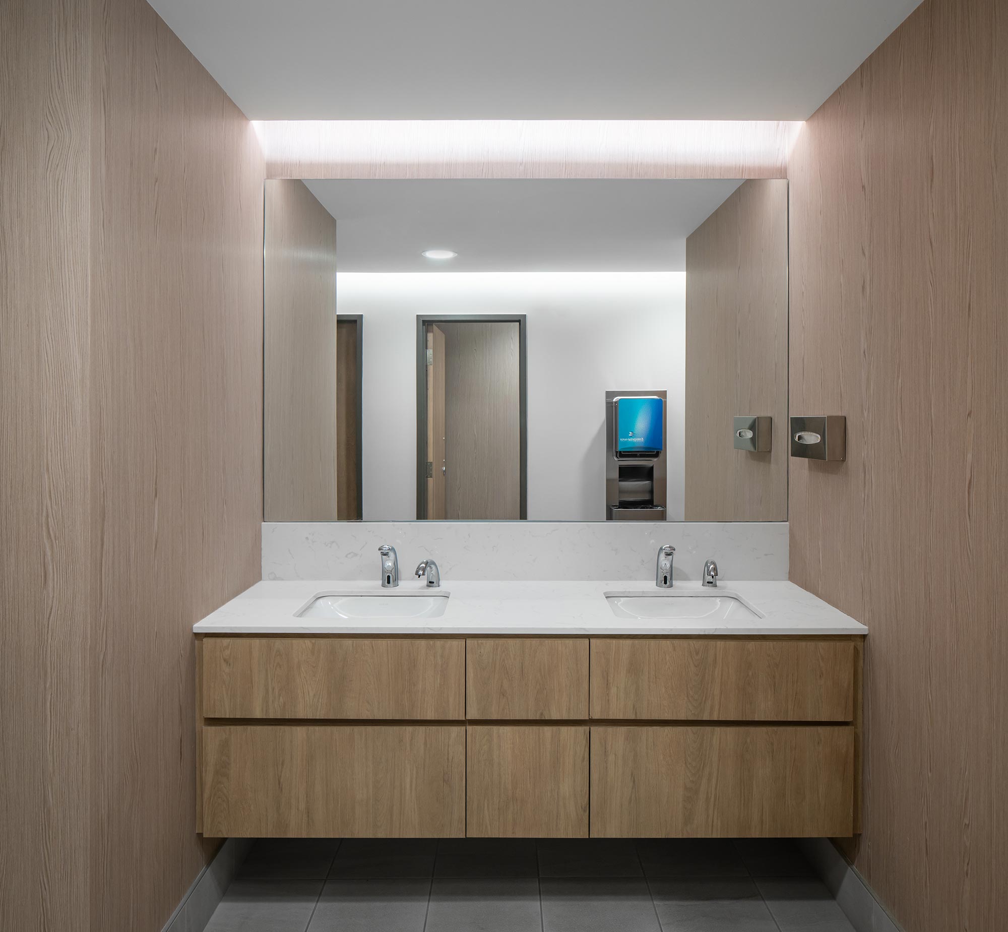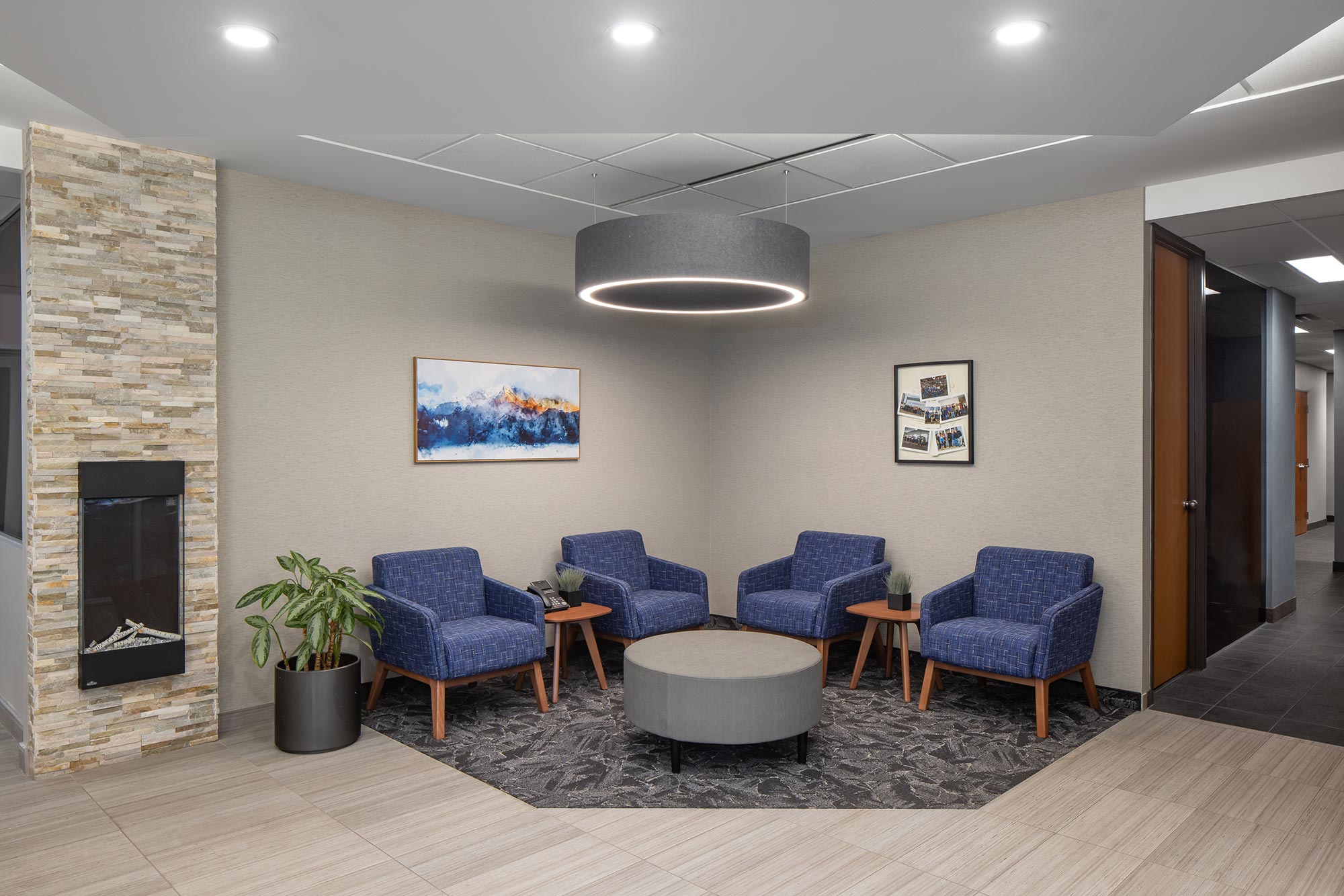 To enhance visual impact and functionality, Cooper Lighting’s Metalux troffers (GRLED series) were used. These troffers were cleverly elevated and surrounded by shadow boxes, transforming them into striking elements that added character and depth to the space. The geometrical pattern created with the encased troffers and patterned acoustic panels, provided both sufficient ambient LED light and a visually appealing design.