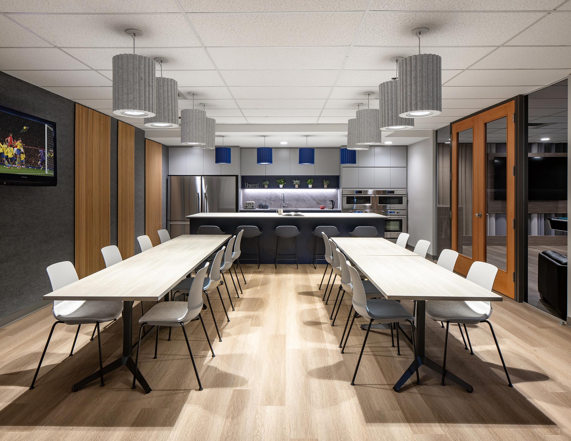 A significant portion of the project focused on integrating acoustic luminaires into high-traffic areas, such as Enterprise Paper’s lunchroom. These luminaires, provided by Edison Lighting, feature Eco Felt Acoustic panels that absorb ambient noise, creating a quieter, more pleasant environment. The Sonic acoustic series from Edison Lighting was used extensively, with luminaires suspended in various shapes—including linear, ring, cylindrical, and drum forms—throughout the office. The availability of these panels in different colours allowed for alignment with Enterprise Paper’s brand, making the entire space feel cohesive and in line with their identity.