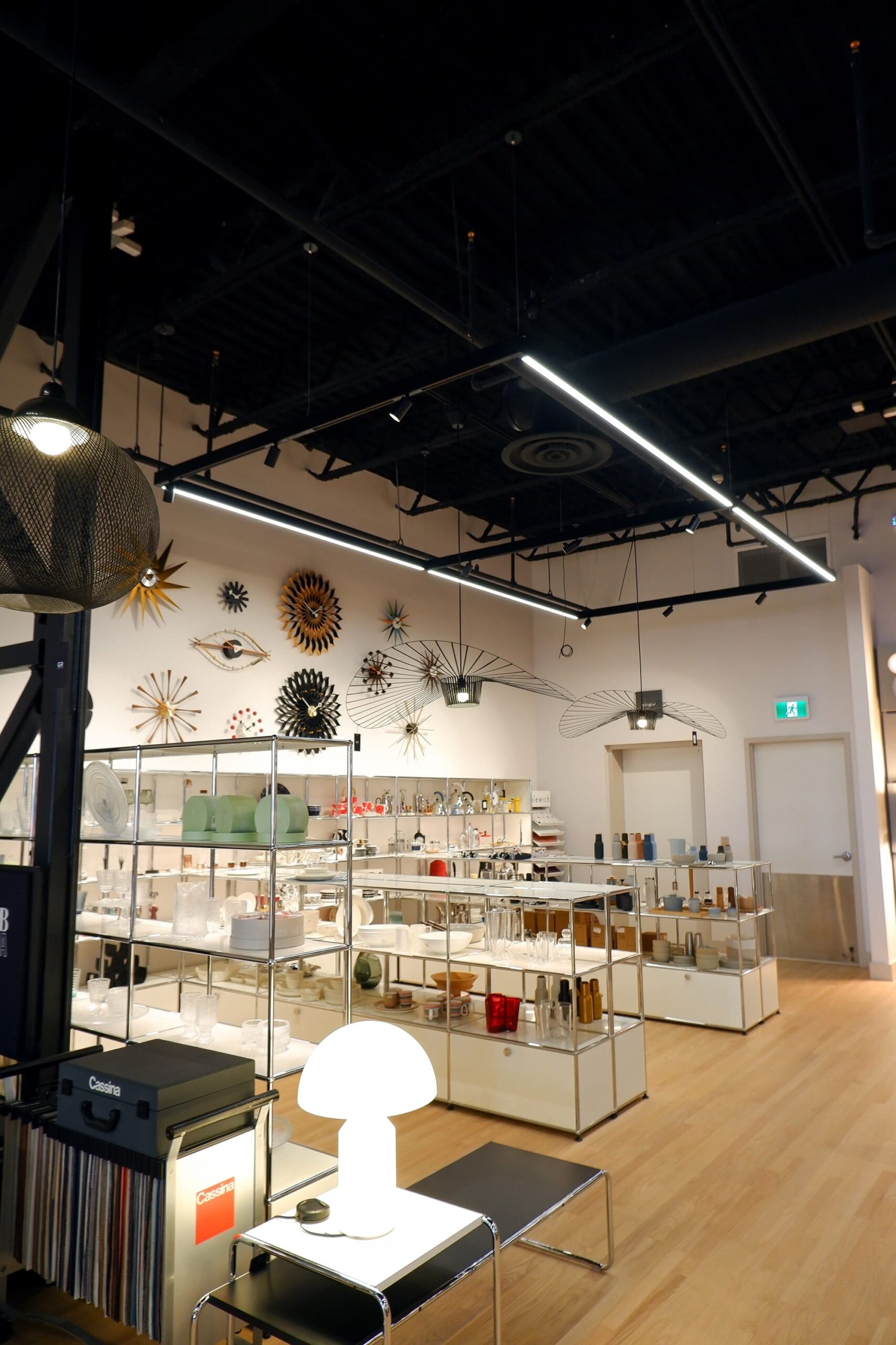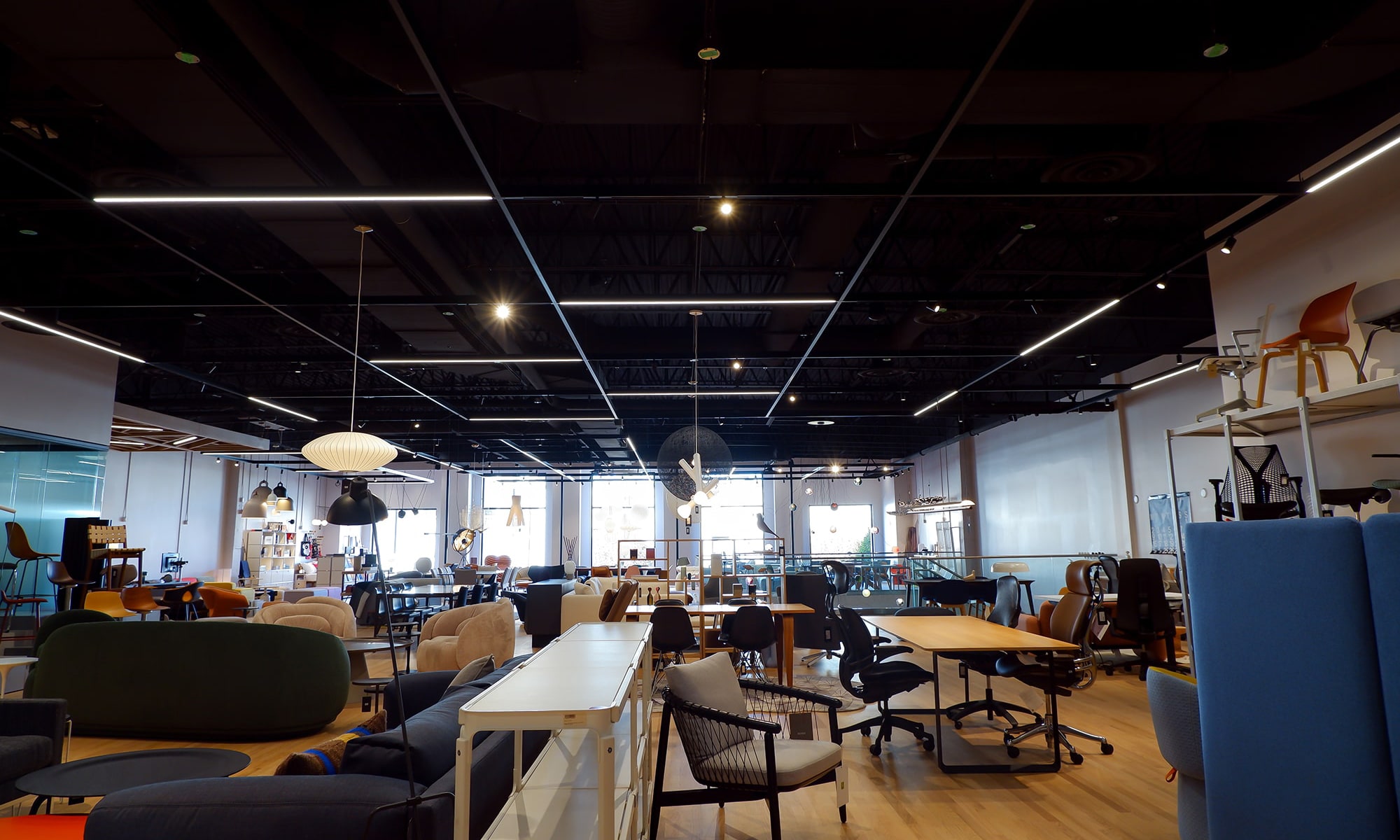 With Gabriel Ross Inc. being a decorative lighting supplier, it was paramount to implement a lighting system that focused on complimenting the luminaires on display throughout the two floors. The key, functional lighting — StencilFlex® from Axis Lighting. The StencilFlex® system’s strength lies within it’s framework. The patented line-voltage delivery system offers maximum flexibility in deployment throughout a space and the ability to control layers of light where needed. The systems design seamlessly blends with the dark exposed ceiling, ensuring that the luxury pieces displayed throughout the 13,000 sqft showroom take centre stage. The flexibility also stems from the track system, which opens countless possibilities of adding lighting accents when needed, such as spotlights, egress and emergency lighting.