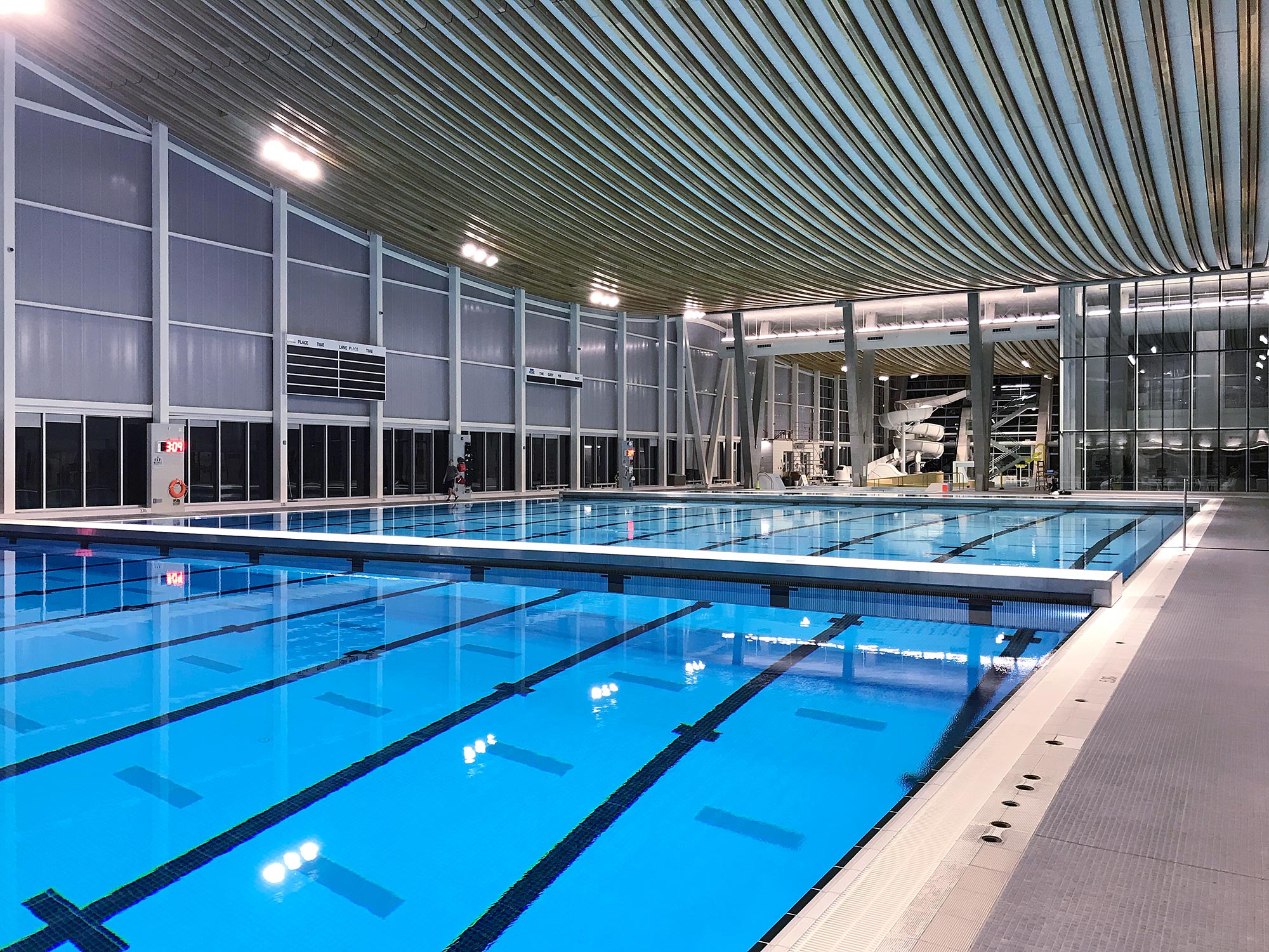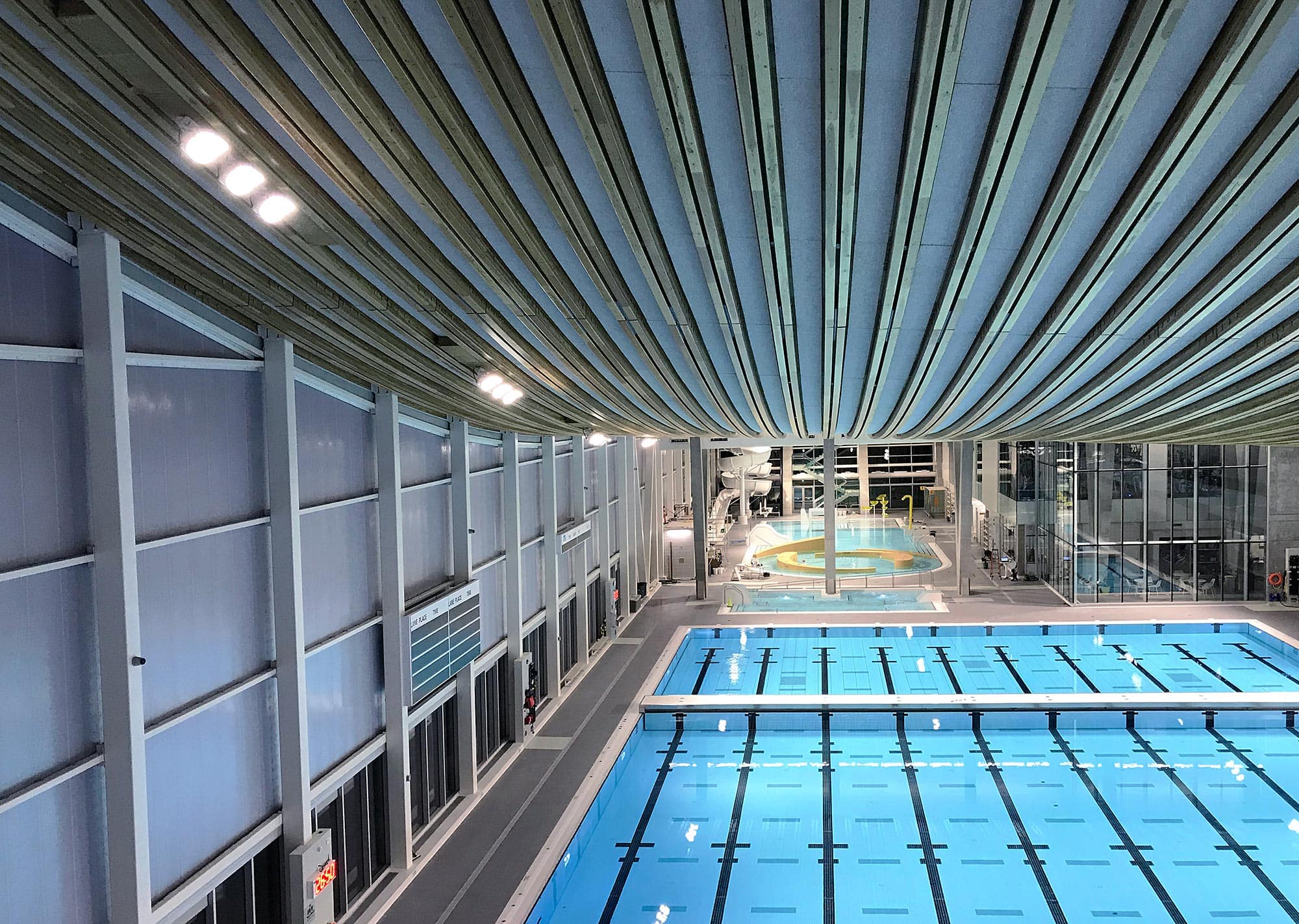 Ten years ago, our team had the privilege of collaborating with AES Engineering to illuminate the Grandview Heights Aquatic Centre in Surrey, BC. Known for its world-class design and the vision encapsulated by Surrey’s motto, “the future lives here,” this facility was built to serve as a community hub for recreational, therapeutic, and competitive aquatic activities. A key focal point of the aquatic centre is the 10-lane, 50-meter FINA-standard Olympic-size competition pool, making it a premier destination for swimmers.