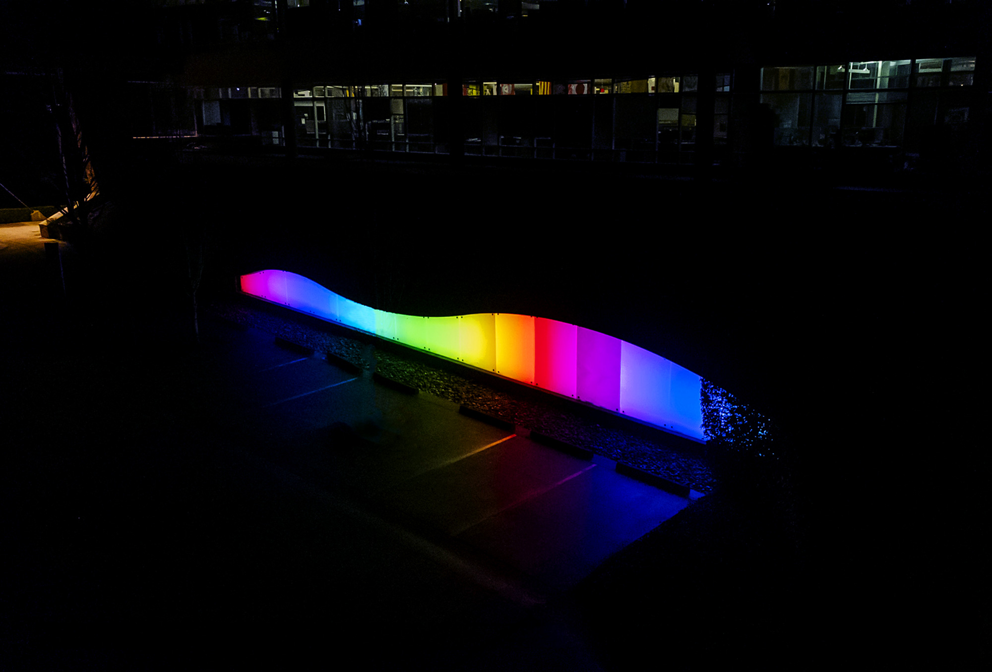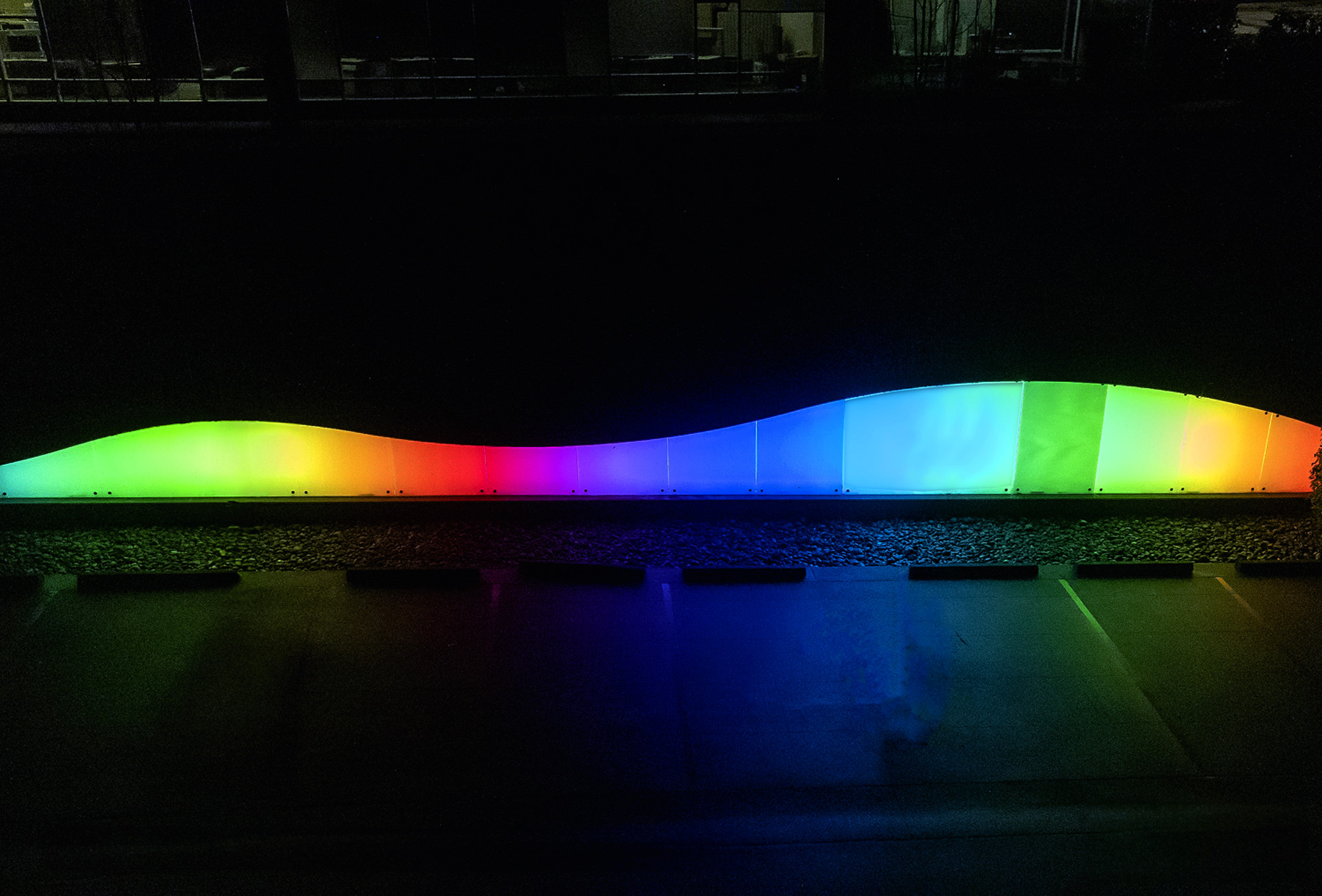 Strategically installed behind frosted glass panels throughout the campus, this installation method served two key purposes: it diffused the light emitted by the fixtures, creating a soft and welcoming ambiance, and it unified the lighting across different areas of the campus. Additionally, a wireless mesh network was employed to ensure that the dynamic lighting displays remained in sync, despite the fixtures being located in various positions from the building to the entrance gate station.