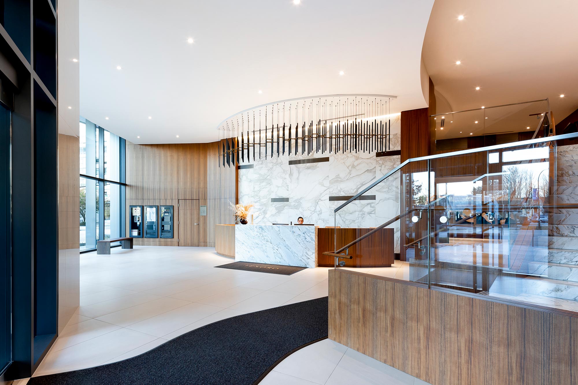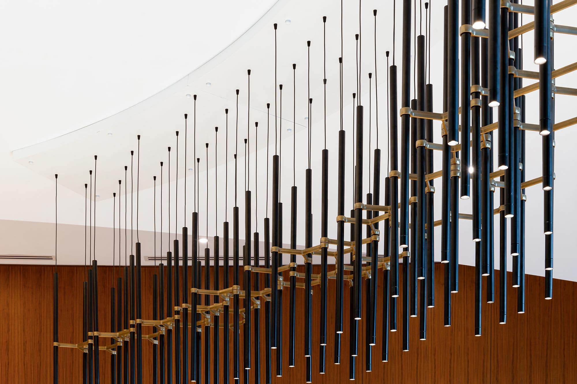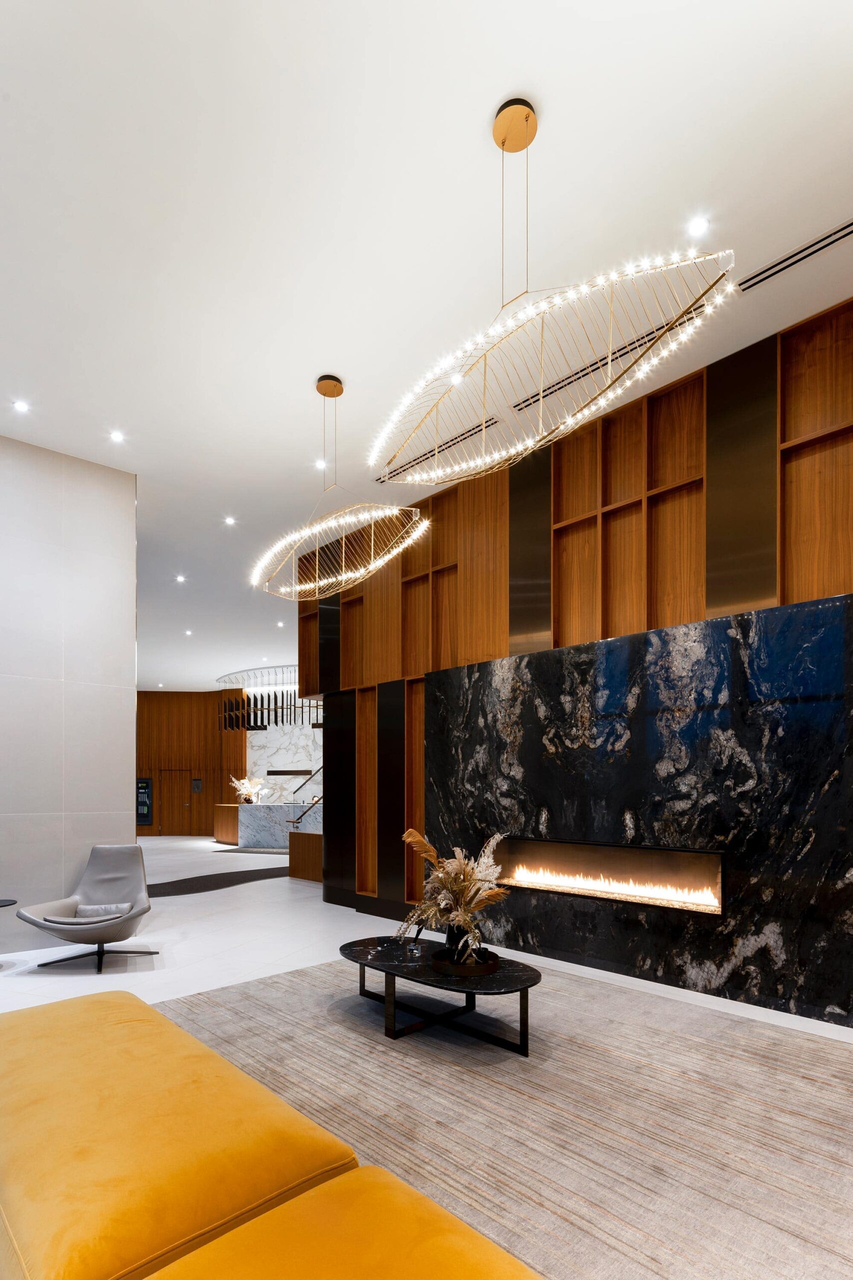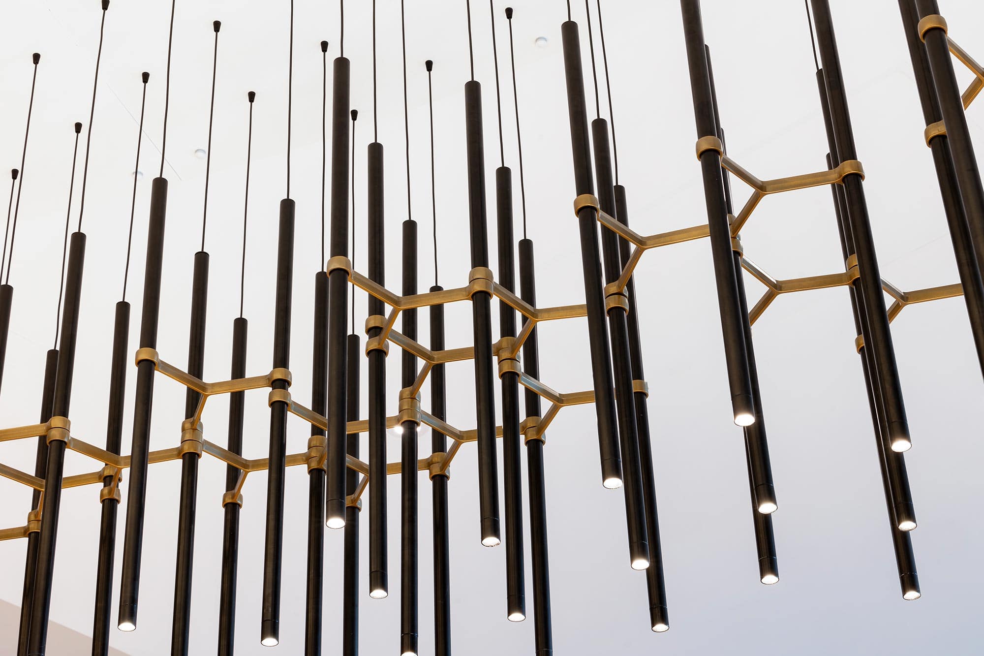 The lobby’s grandeur is defined by two striking lighting installations from Zaneen. Suspended above the reception desk, the Metropolis-Y creates a bold yet refined statement. A series of single 1-inch diameter tube pendants form geometric compositions, using elegant Y-shaped die-cast aluminum connectors. This custom installation was reconfigured from the original design to accommodate adjustments in the concierge desk, with a bespoke canopy built to seamlessly blend function with aesthetics.