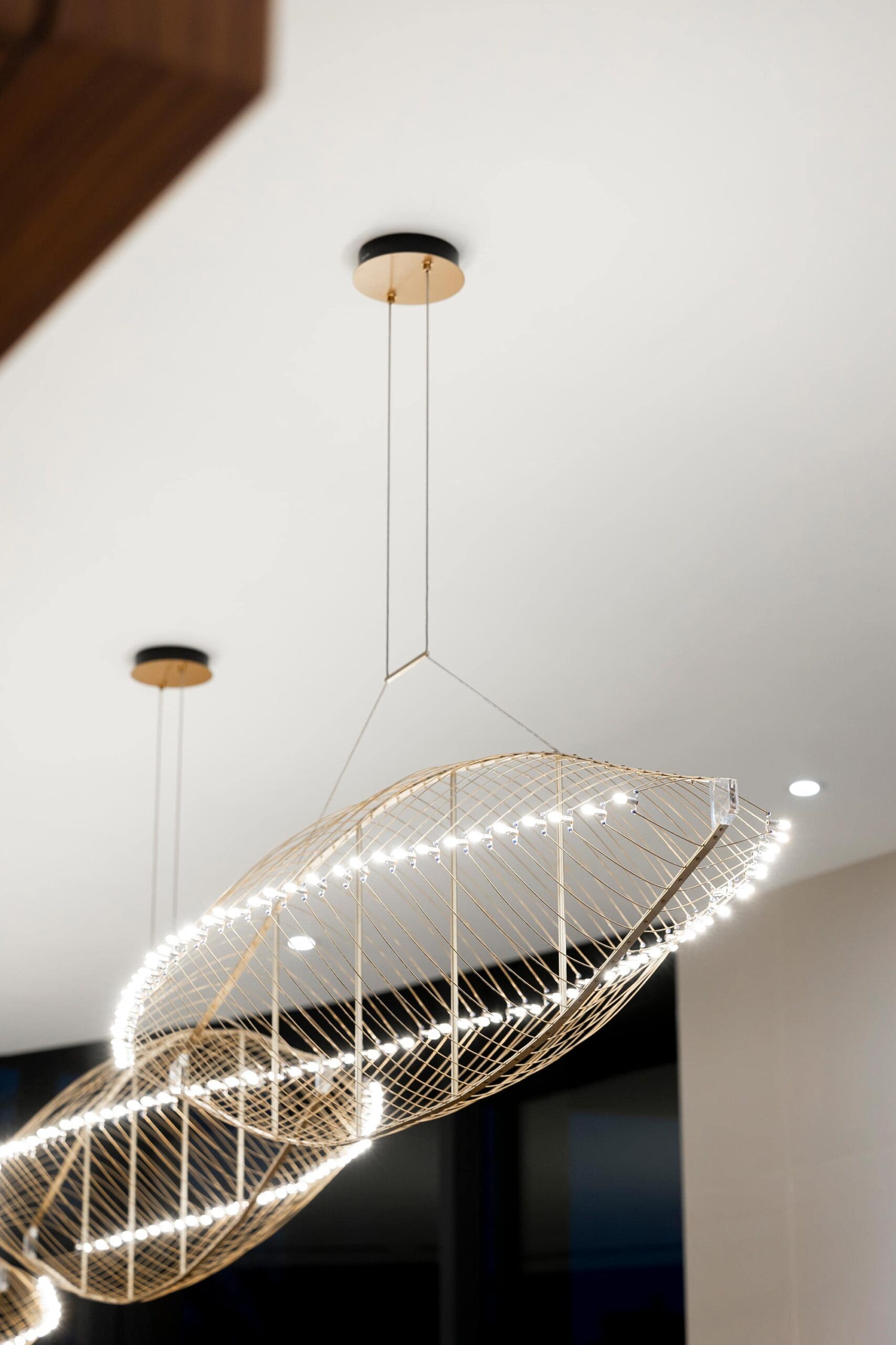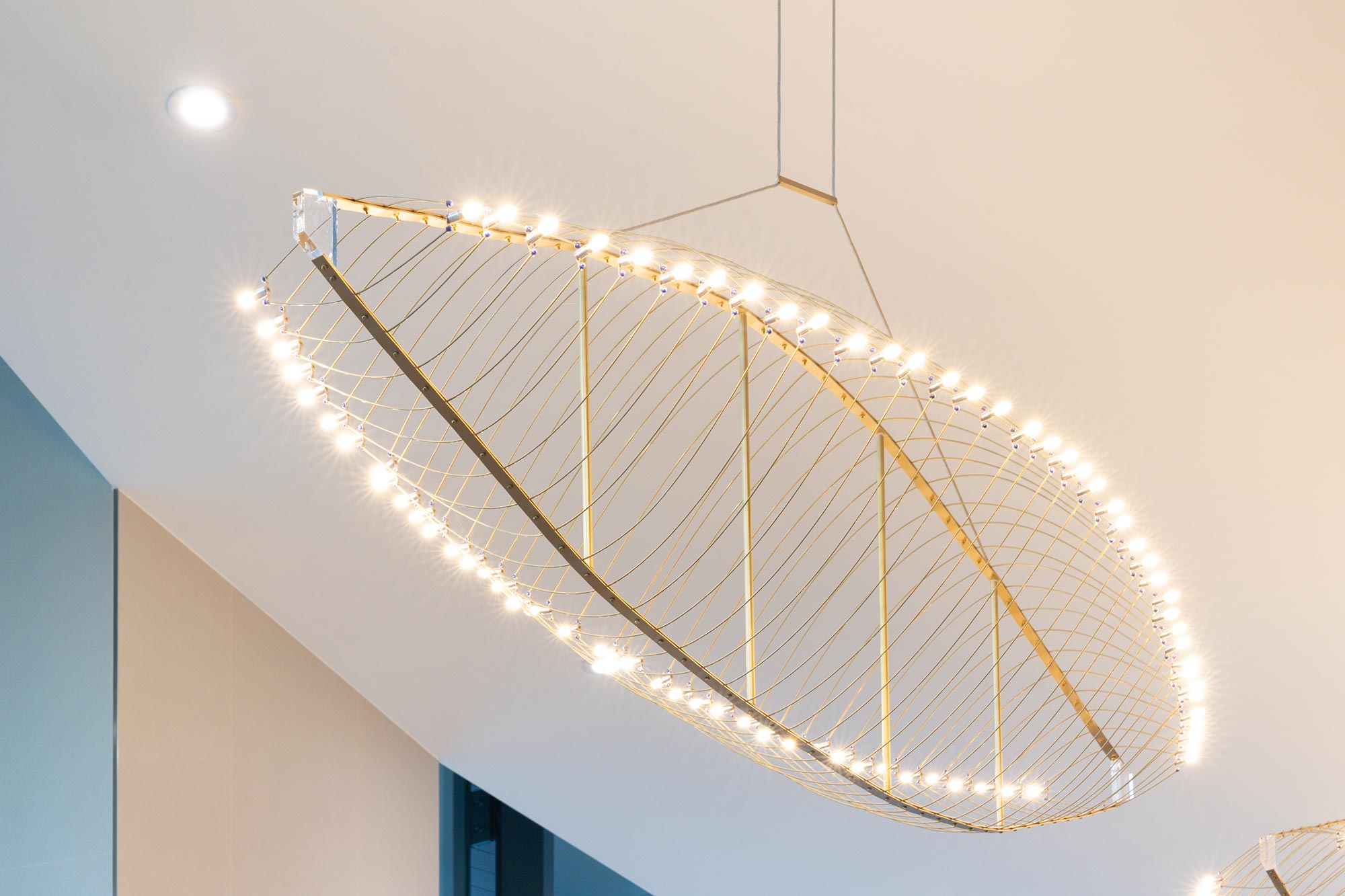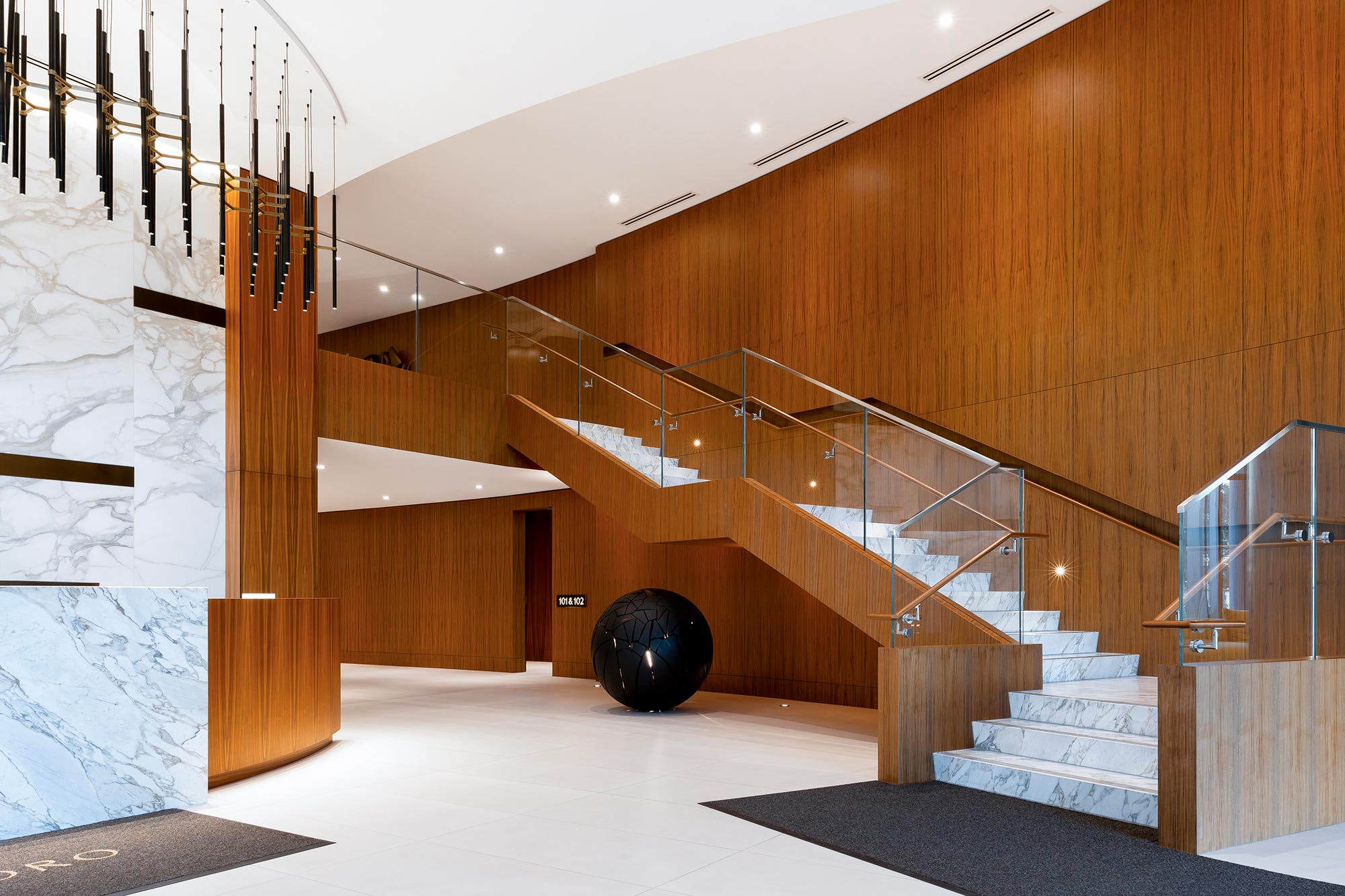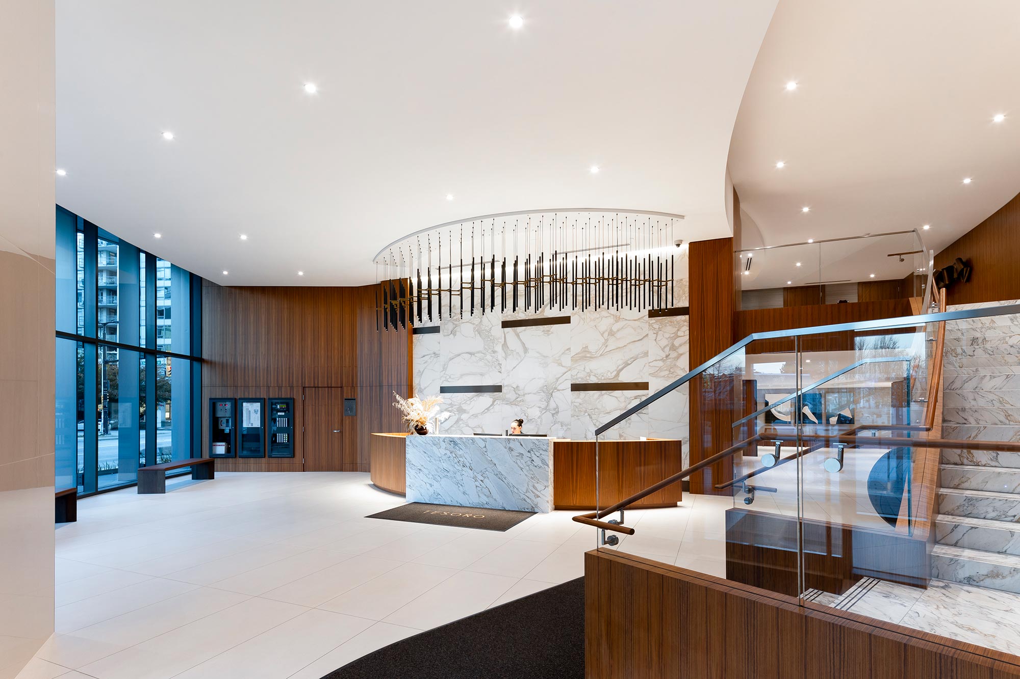 The lobby’s grandeur is defined by two striking lighting installations from Zaneen. Suspended above the reception desk, the Metropolis-Y creates a bold yet refined statement. A series of single 1-inch diameter tube pendants form geometric compositions, using elegant Y-shaped die-cast aluminum connectors. This custom installation was reconfigured from the original design to accommodate adjustments in the concierge desk, with a bespoke canopy built to seamlessly blend function with aesthetics.