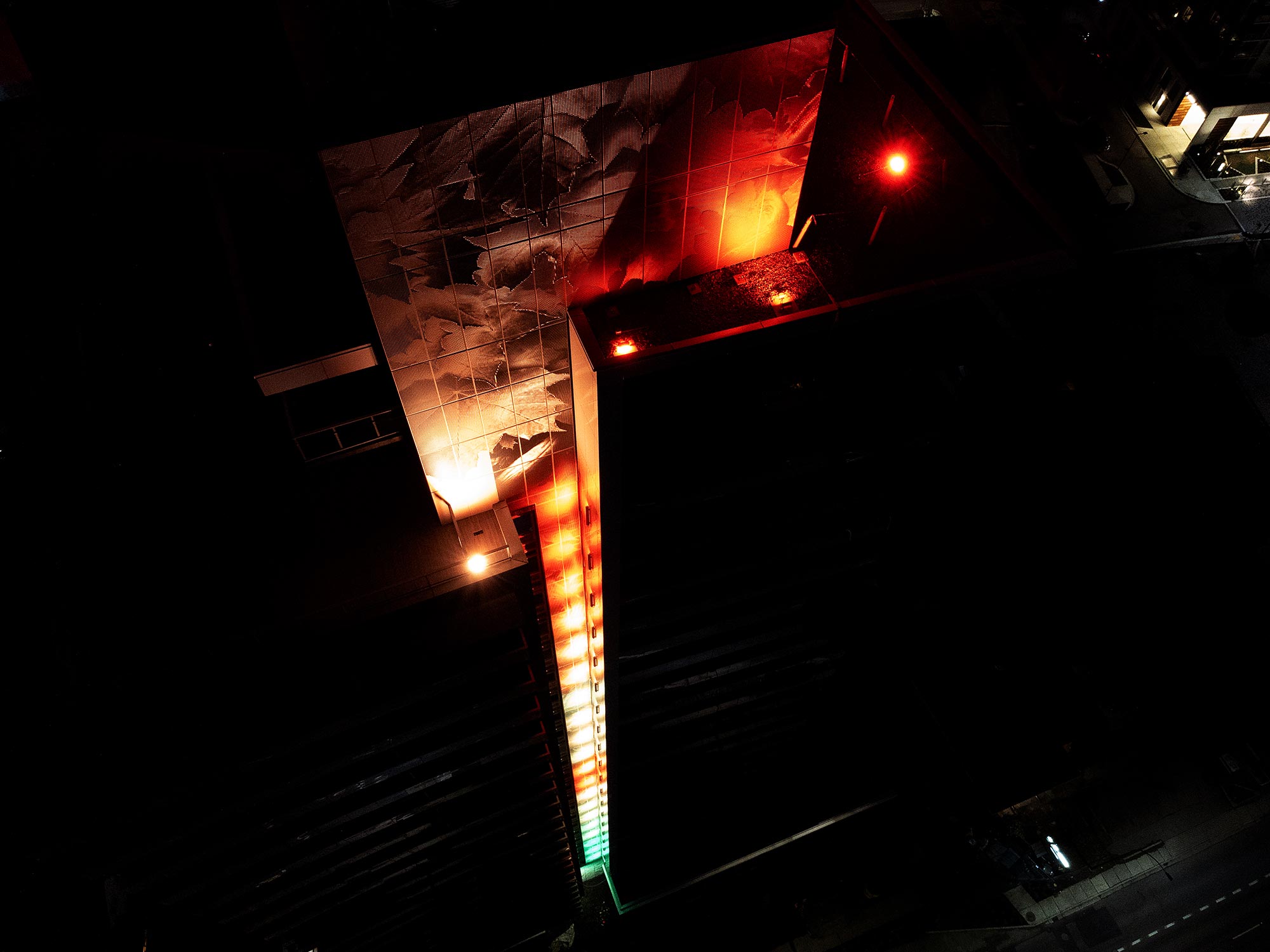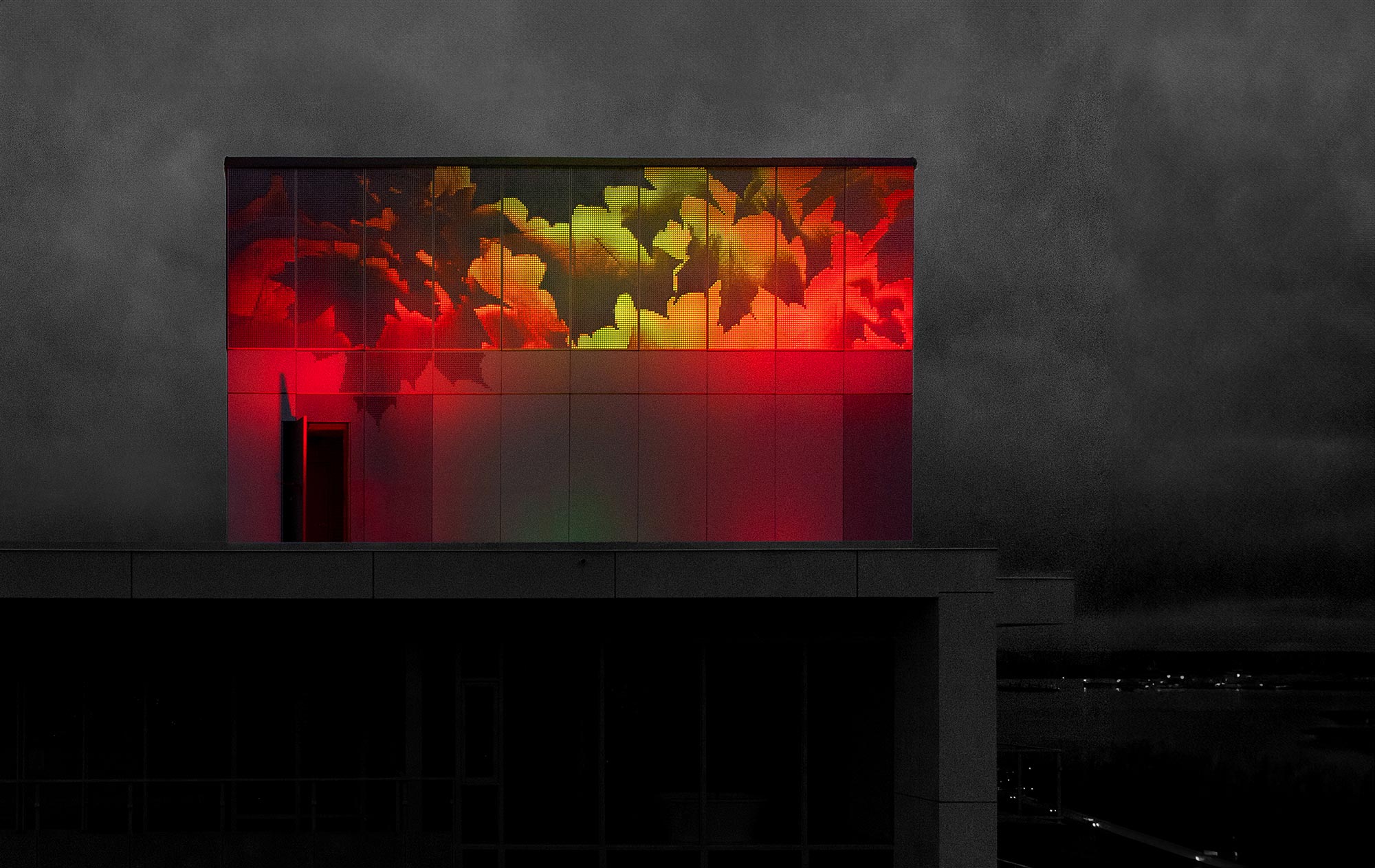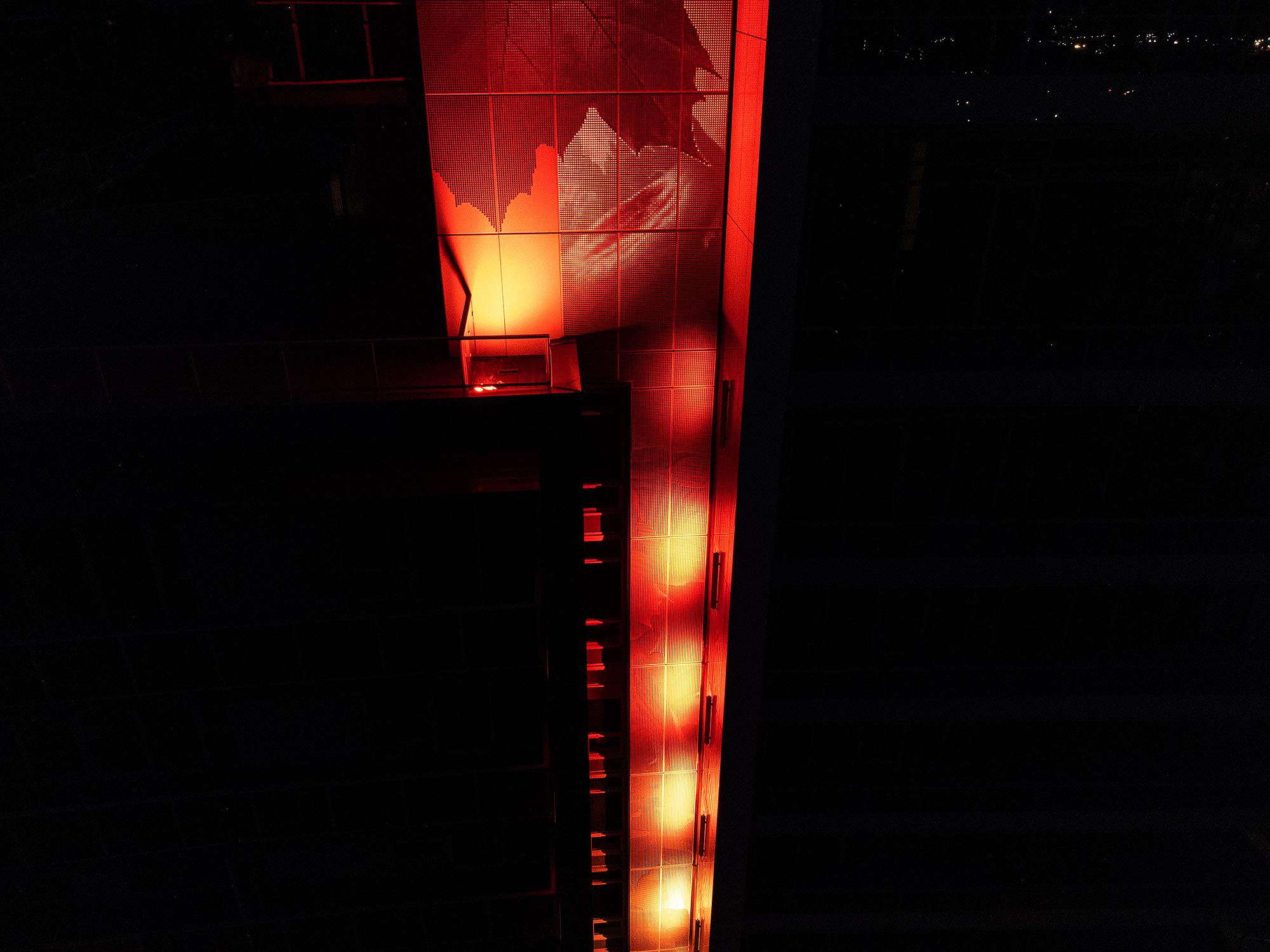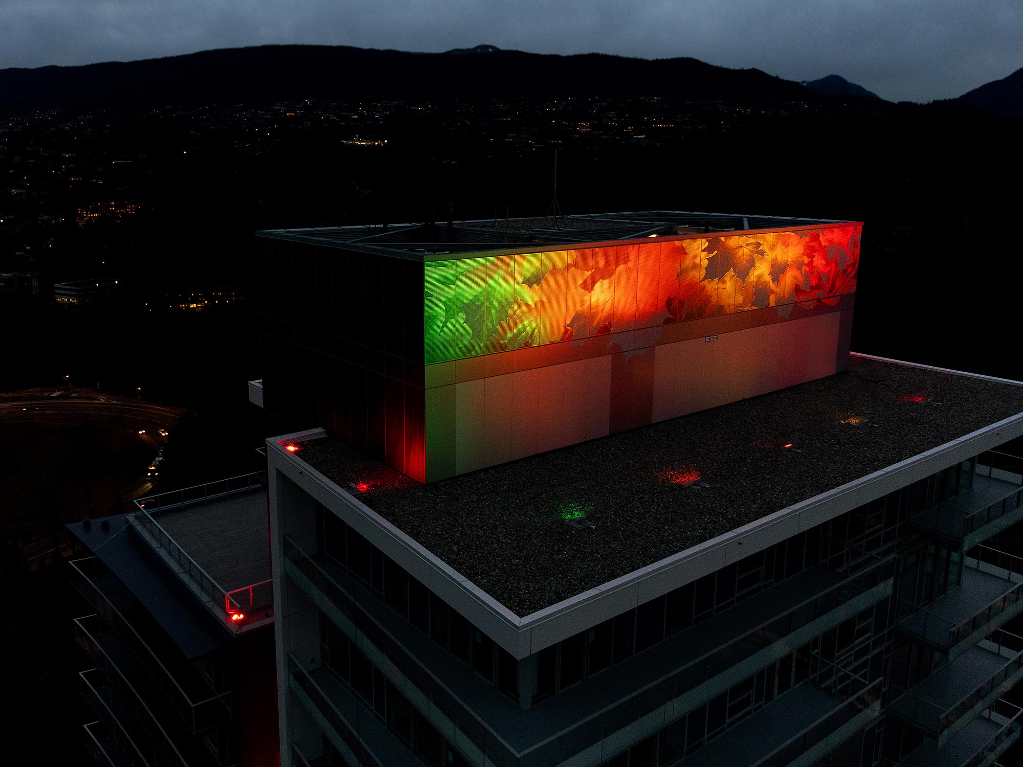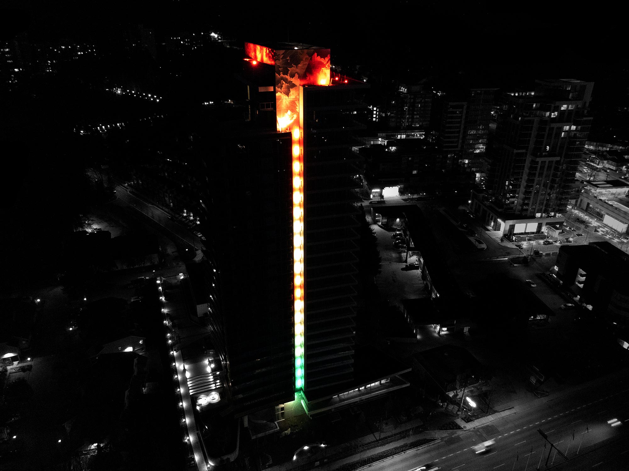 The Sentinel, an elevated residential 26-storey development, is becoming a new marquee statement to the West Vancouver skyline in part to the illuminated Ombrae Vinea Canopy. The combined vision of Ombrae Studios and Denna Homes was to mimic nature’s seasonal shift by utilizing transitional green, red and yellow lights.
