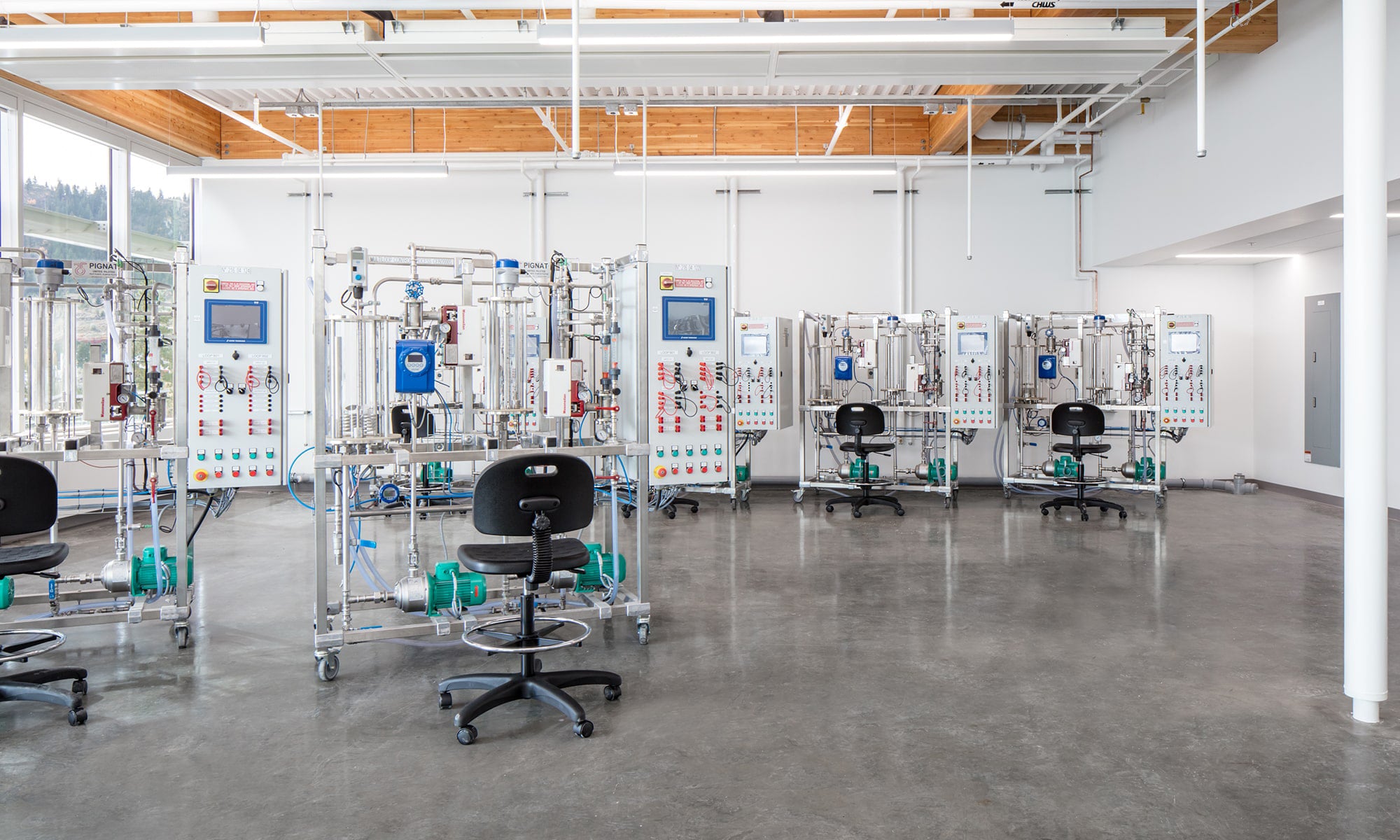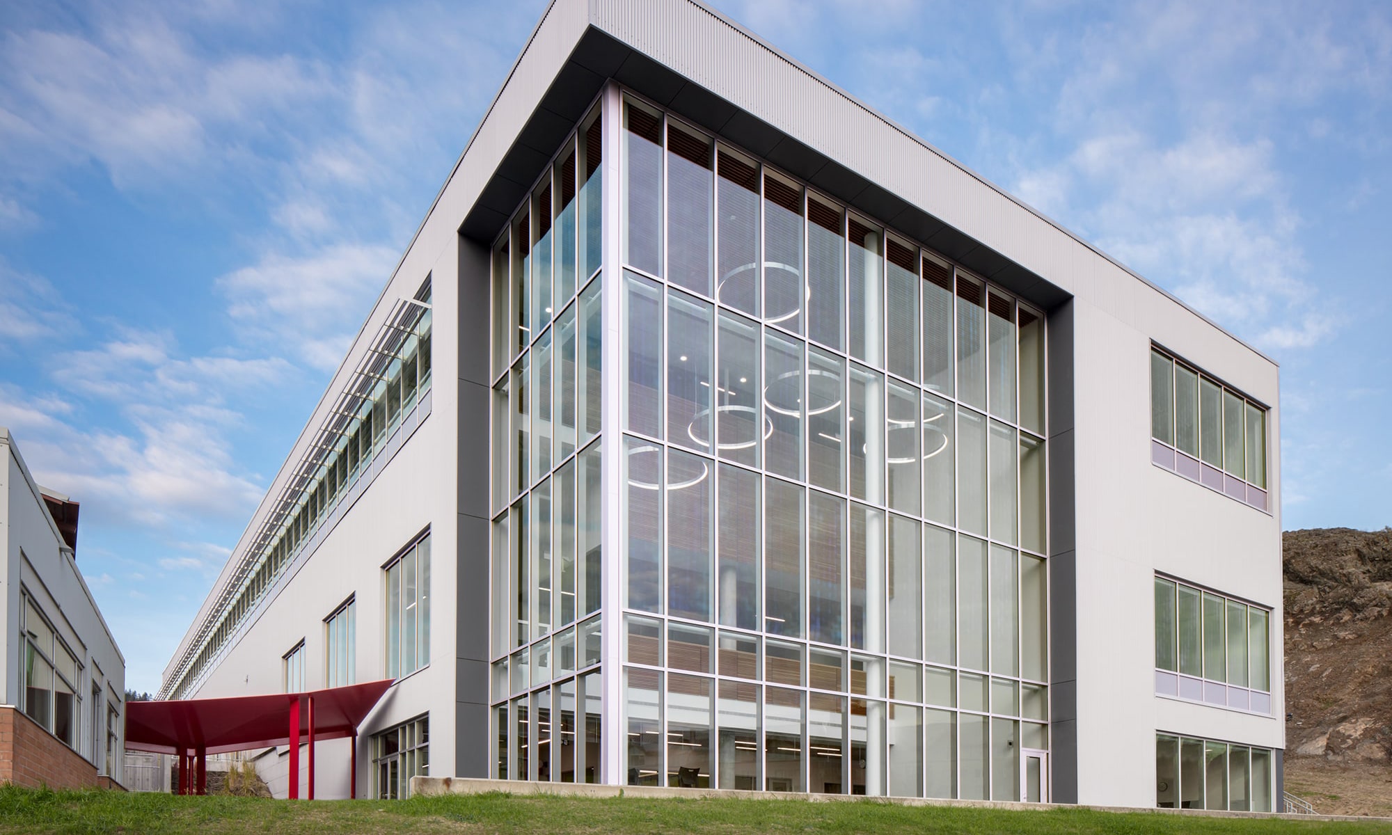 Thompson River University (TRU), based in Kamloops BC, needed to meet an increasing student and labour-market demand. In 2018 they completed the $32M, 5,344-square-meter Industrial Training and Technology Centre (ITTC) that supports an increase of 550 full-time-equivalent students. Recognized as a Gold LEED-certified building, the TRU ITTC required lighting to fit various needs throughout the facility; most notably an extraordinary LED fixture that would complement the minimalist decor, perform as an engaging grand entrance focal point, and suspend from immensely high ceilings.