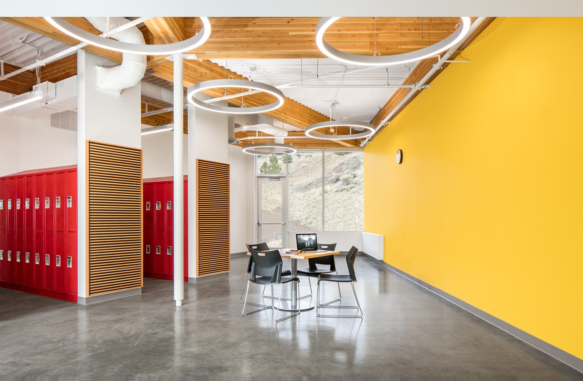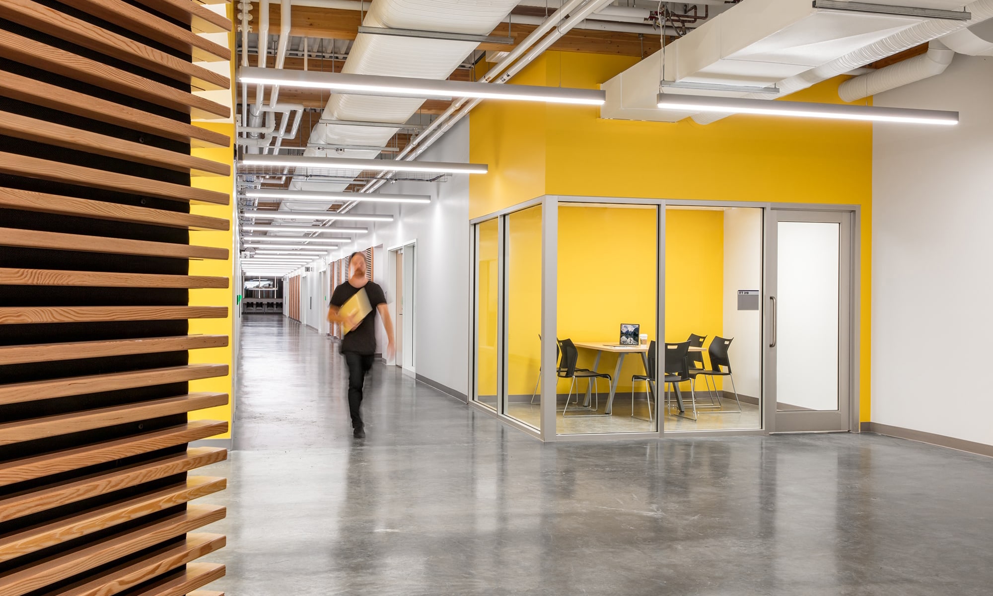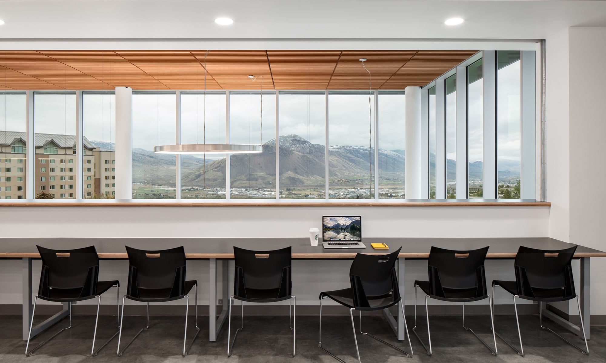 The open concept space features concrete pillars, a steel and wood frame roof as well as the neutral white (4000K) lumens from the Zaneen Glorious Slim 1550 suspended fixture; prominently featured in the building entranceway. Glorious is an oversized geometric surface light fixture that adds a dramatic flair to any space with uniform illumination. A visual fusion of pop art and science fiction, this Austrian-manufactured sculpted luminaire is ideal for staging extraordinary spaces, such as TRU’s ITTC entrance.