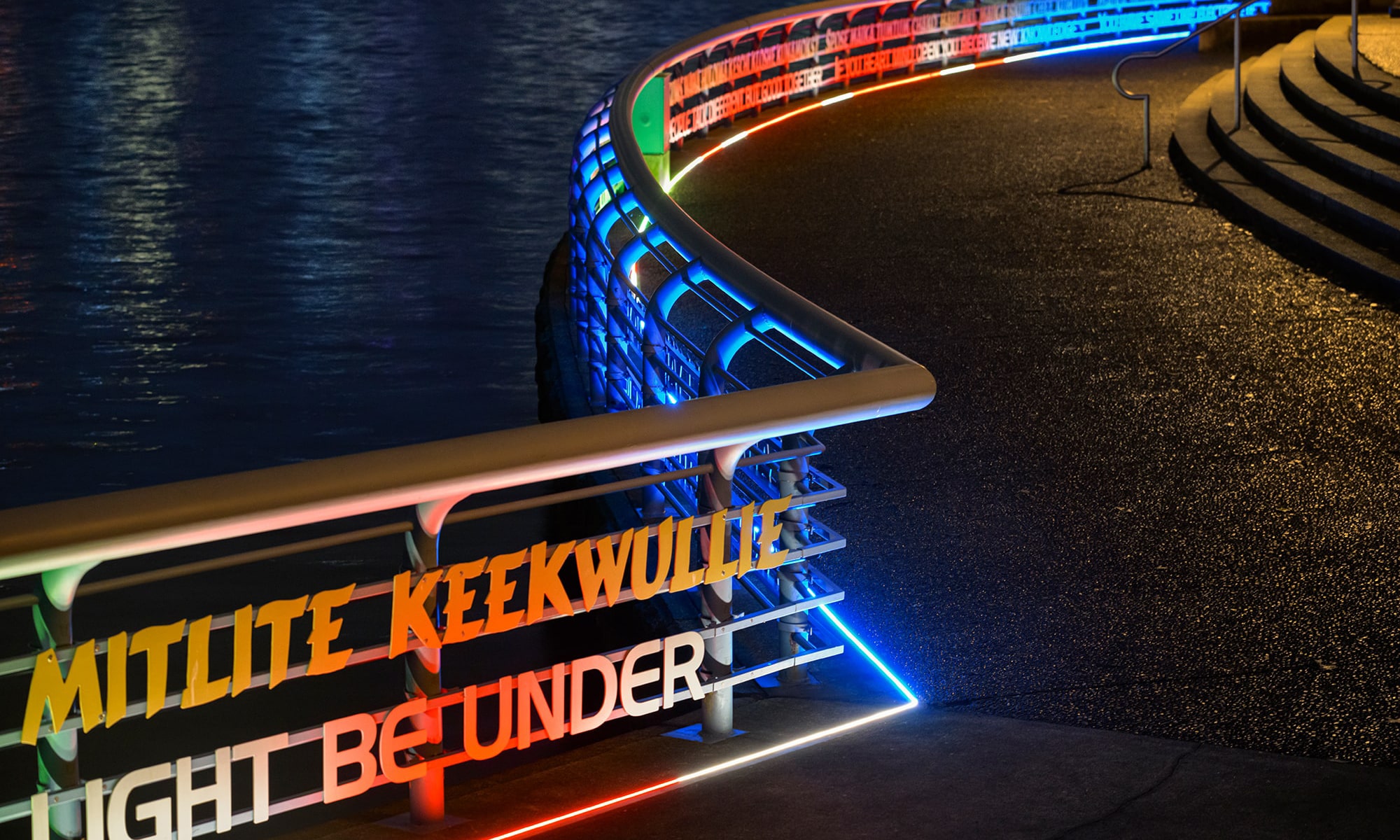 After several test installations, the new LED technology, recessed into the concrete, allowed the artist to re-envision the ‘message’ of the piece. In addition to the Chinuk Wawa and English text (a metaphor for the ongoing development of intercultural communications within the region), the lighting creates a form of ‘electric telegraphy’ (aka morse code). The Chinuk Wawa text was translated into dots and dashes before being converted into bands of light from vessel navigation systems. The streams of colour flow for 2 hours and 16 minutes in a singular direction before reversing in the other with a dominant colour set for each rotation.